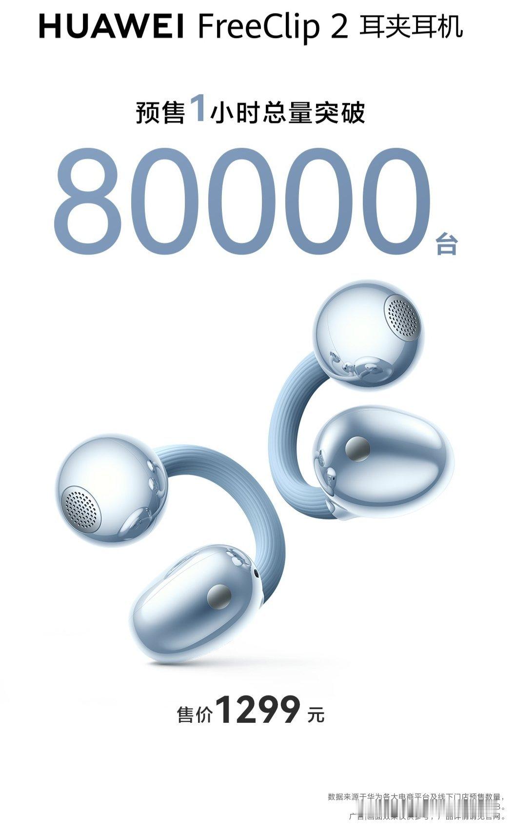 【华为 FreeClip 2 耳夹耳机预售 1 小时总量突破 8 万台,售价 1299 元】