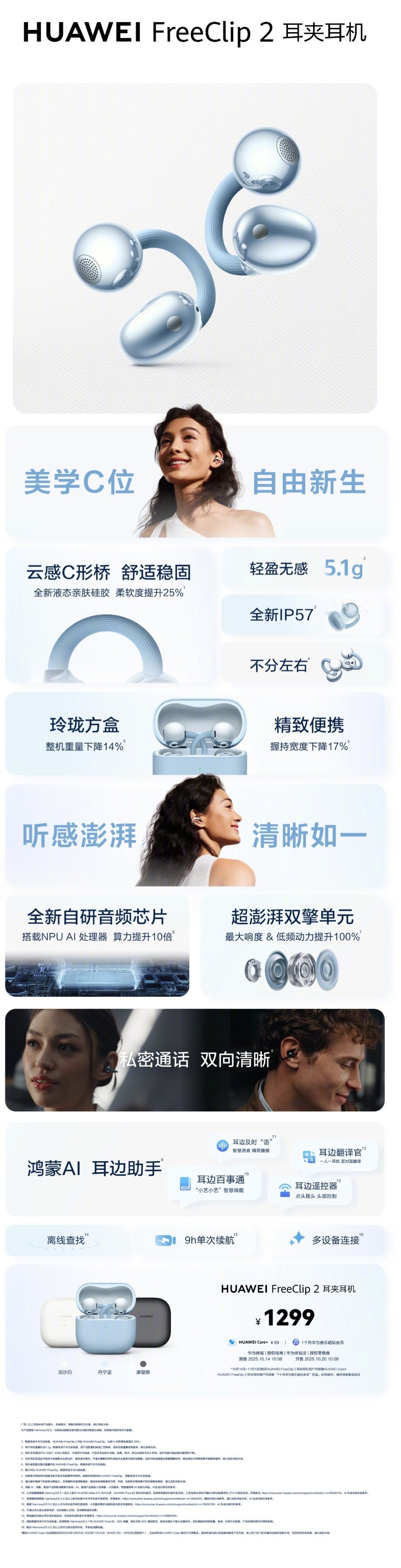其他方面,华为 FreeClip 2 升级亲肤液态硅胶材质,搭配高性能记忆金属,柔软度提升 25%,单耳重 5.1g,耳机支持 IP57 防尘防水。