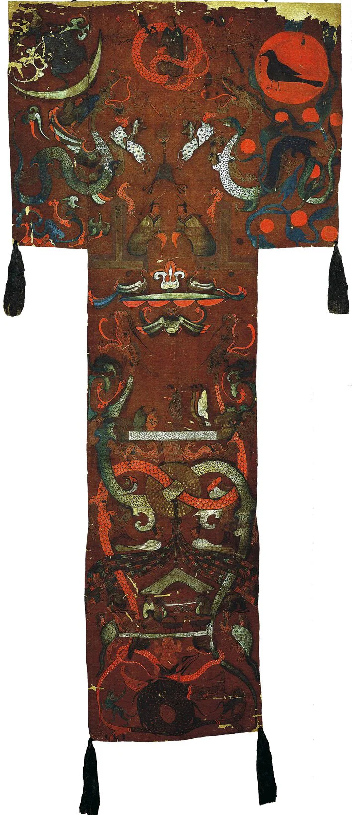 汉墓马王堆一号墓中出土的这件帛画,内容丰富精采,保存完整,呈现T字型,上宽下窄,总长约二十两百多米;它的制作方式,是用三块绢拼接而成的。