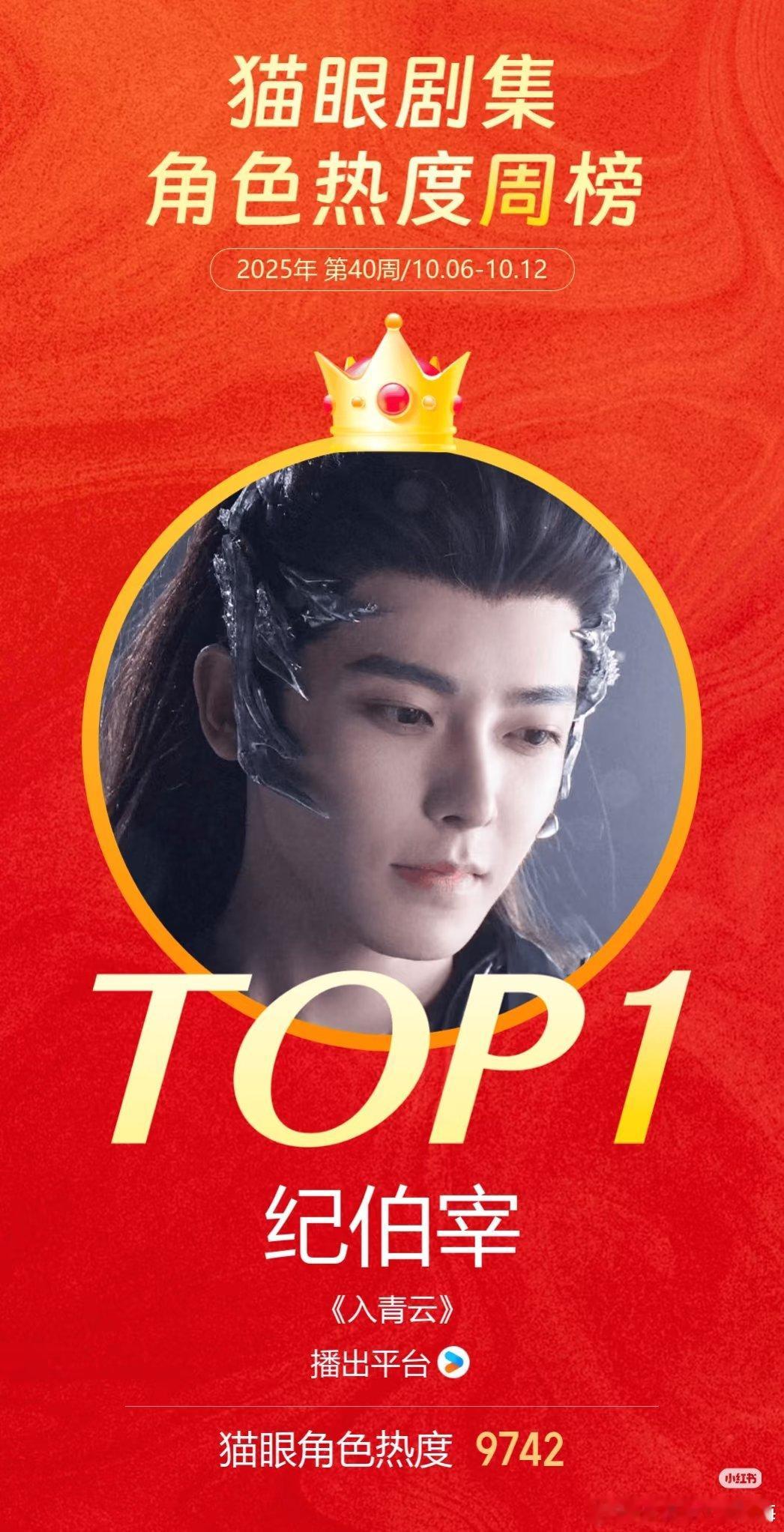 侯明昊《入青云》中饰演的纪伯宰登顶猫眼角色热度周榜top1