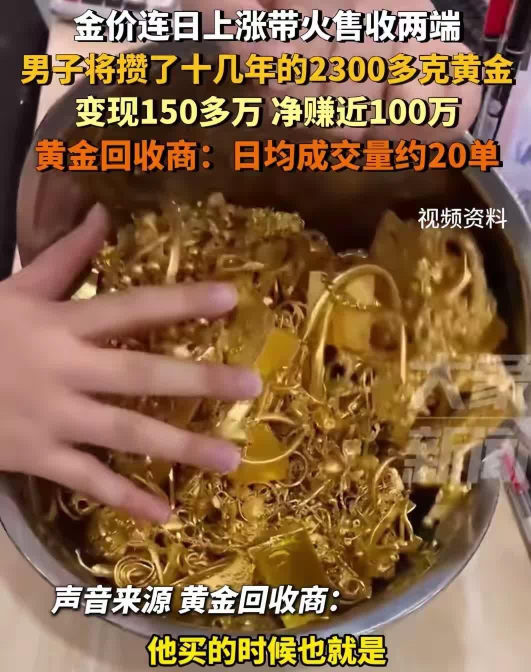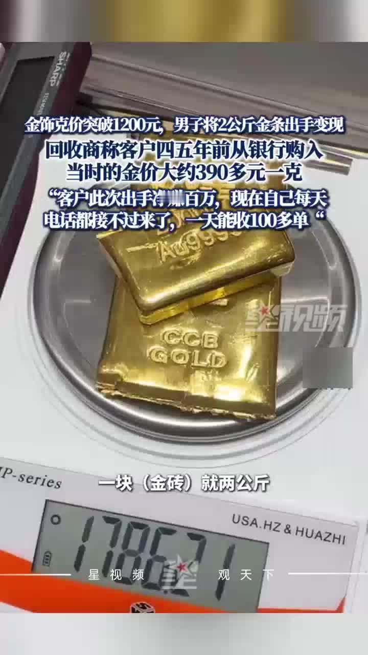 10月14日,山东烟台有位男子可真是厉害,变现2公斤金条净赚100万元!原来,这些金条是他在四五年前从银行购入的,当时金价大约是390多元一克。如今,金饰克价已然突破1200元,如此巨大的差价让他赚得满当当。 黄金回收商孙先生表示,这位客户一出手就赚了百万,把自己忙得不可开交,电话都接不过来,一天能收到100多单。看来,黄金投资有时真能带来意想不到的财富。不知这位男子当初购买金条时,是否料到能赚这么多,只能说他眼光着实独到! 投资金条金价 投资金条 黄金超十万 金条市场 黄金大赚 银行实物金条