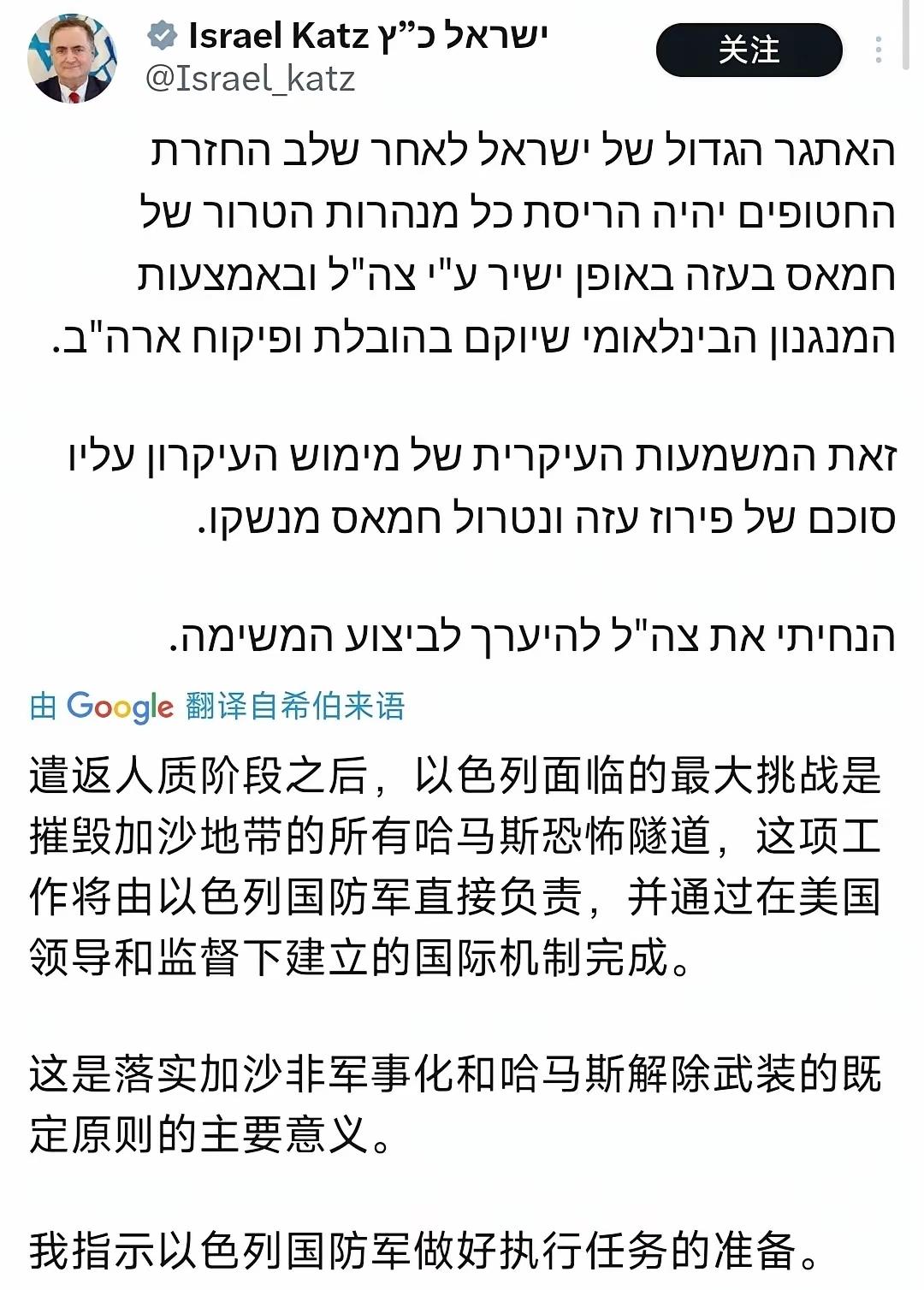 加沙战争结束?以军可不这么想,放话“继续拆除哈马斯地道” 哈以停火后,哈马斯几天内在整个加沙地带部署了7000人部队维持治安,不少人都是通过地道快速行动,这果然吓到以军了。 当地时间12日,以色列防长卡茨在社媒上宣布,他已经命令以军下达做好执行任务的准备。 在接收被释放的人质后,彻底摧毁哈马斯在加沙地带的所有地道,以落实加沙非军事化和哈马斯解除武装的要求。 以色列防长的这番话,不仅仅是一次普通的军事声明,而是在向全世界展示以色列在这场长期冲突中的决心,哈马斯通过地道进行兵力调动和战略部署,显然是他们的一大优势。 这些地道不是简单的地下隧道,它们连接着加沙地带的各个关键位置,不仅可以用来转移人员和装备,甚至还能作为军事指挥和储存设施的藏身处,因此,摧毁这些地道,显然是以色列解决加沙问题的一项核心任务。 但是,这背后的问题也值得深思。哈马斯的地道系统,代表了它在加沙的生存能力。长期以来,加沙地带的战斗环境复杂且封闭,哈马斯并没有足够的常规军力与以色列军队对抗。 于是,他们依靠这些地道建立起了一种独特的防御和进攻体系。可以说,这些地道不仅是军事设施,也是一种“生存战略”。 如果没有这些地道,哈马斯的反抗力量恐怕早已被消耗殆尽。以色列试图通过摧毁这些地道来彻底切断哈马斯的生命线,实际操作起来,恐怕远没有想象中那么简单。 另一方面,哈马斯的存在不仅仅是一个军事问题,它更深层次地涉及到加沙民众的生存问题。 停火后,哈马斯派遣部队维持治安,这一举措看似有效,但也暴露出一个更大的问题:加沙地带的政治和社会结构依然处于动荡之中。 即便以色列摧毁了哈马斯的地道,剿灭了哈马斯的军事力量,但如果没有一个稳定的政治过渡和对民众的有效治理,停火协议恐怕只会是一纸空文。 毕竟,和平不仅仅是军事层面的事情,更是政治和社会层面的长期努力。 对于以色列来说,摧毁哈马斯地道的战略虽然能够暂时压制哈马斯的活动,但这是否意味着加沙的局势就会得到彻底解决? 或许,这只会是战斗的一个阶段性胜利 ,在这种局面下,持续的军事行动可能会带来更大的国际压力。 尤其是在人道主义援助和加沙民众生活状况方面,国际社会的关注将愈加加强。而以色列是否能够有效应对这些挑战,仍然是一个不小的考验。 如果从更大的角度来看,这场冲突暴露出的另一个问题是,全球对以色列和巴勒斯坦的态度依然分歧巨大。 在美国等一些西方国家的支持下,以色列的军事行动获得了广泛的背书,但与此同时,许多阿拉伯国家和国际组织却对以色列的行动表示强烈反对。 加沙地区的局势,也被视为中东地区长期政治对抗的缩影。在这种大环境下,单纯依靠军事手段解决问题,只会使局势更加复杂。 最后,以色列防长的言论虽然充满决心,但如何在摧毁哈马斯的军事力量之后,建立一个和平、稳定的加沙地区,仍然是一个悬而未决的问题。 以色列需要考虑的不仅是军事胜利,更是如何在这一过程中确保地区的长久稳定。这种平衡的复杂性,远超外界的想象。 各位读者你们怎么看?欢迎在评论区讨论。以军加沙行动 加沙停火