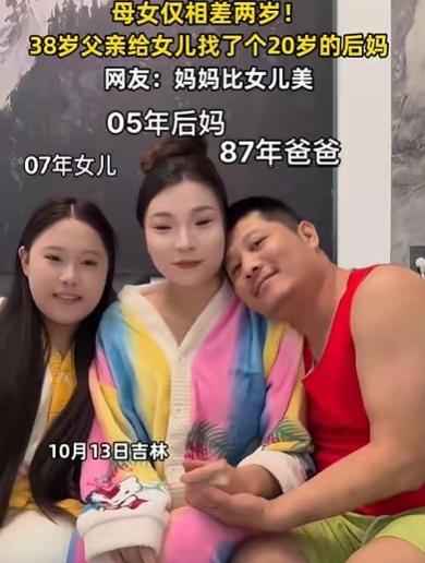 这事儿看完我直呼好家伙!吉林38岁大哥离婚后,居然给18岁女儿找了个20岁后妈,俩姑娘就差两岁,这关系听着都新鲜! 大哥87年的,新媳妇05年的,女儿07年的,当初确定关系时,大哥心里直打鼓,怕女儿膈应。没成想后妈第一次上门就找对了路子,俩人凑一块儿聊追星、说穿搭,饭桌上唠得比亲娘俩还热乎,大哥悬着的心才算放下来。 网友评论也逗,有人说“结婚六年换仨丈母娘,是老丈人牛逼”,还有人调侃“这男的20岁当爹,现在又娶20岁媳妇,无缝衔接”。其实这“同龄人后妈”还真有优势,没有长辈那层隔阂,女儿有啥心事都愿意跟后妈说,不像跟老一辈似的没共同话题。 日子说到底是自己过的,只要一家人处得开心,外人咋说都不重要。你们身边有这种打破常规的家庭组合不?要是换做你家,能接受差两岁的后妈不?