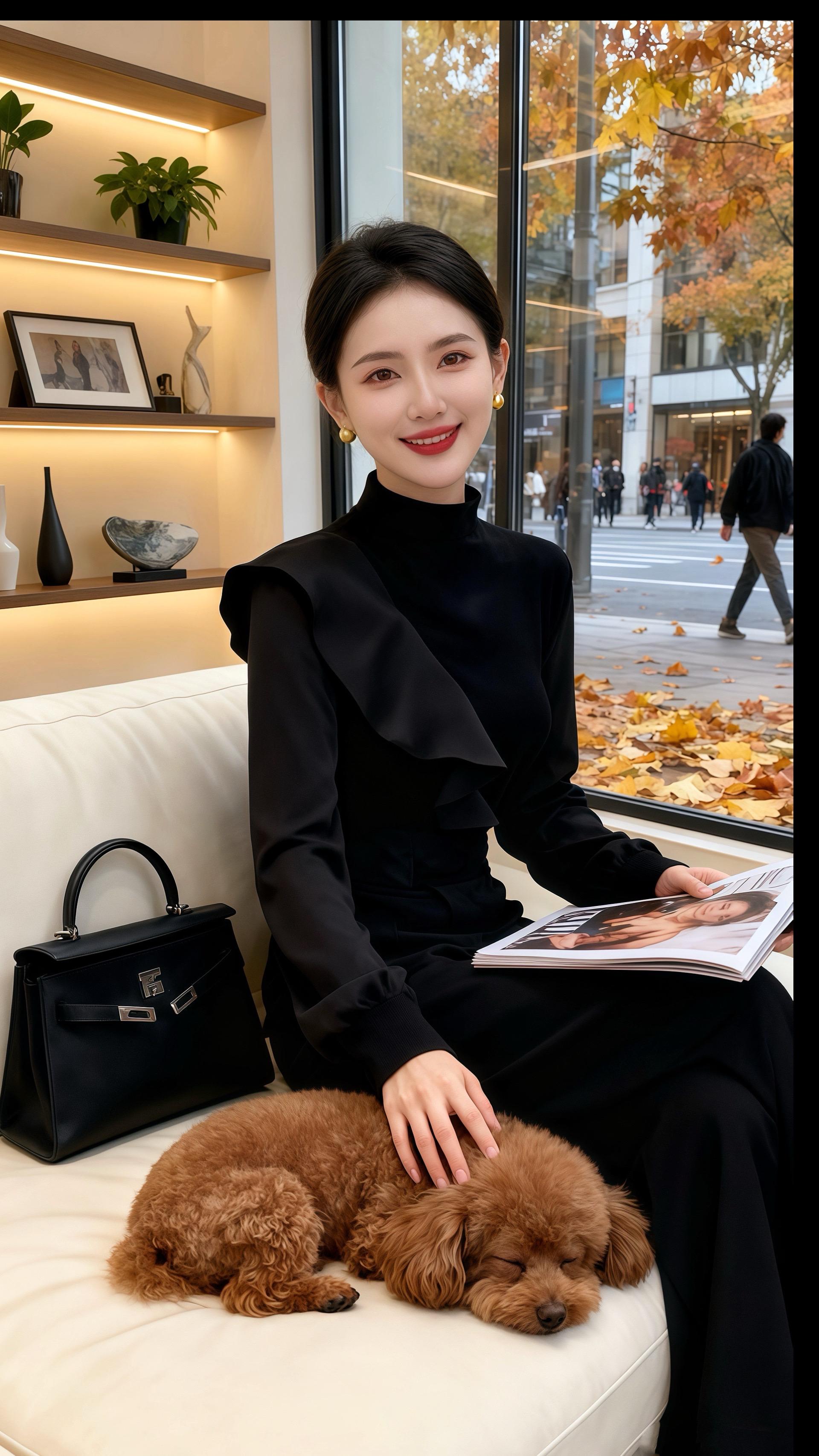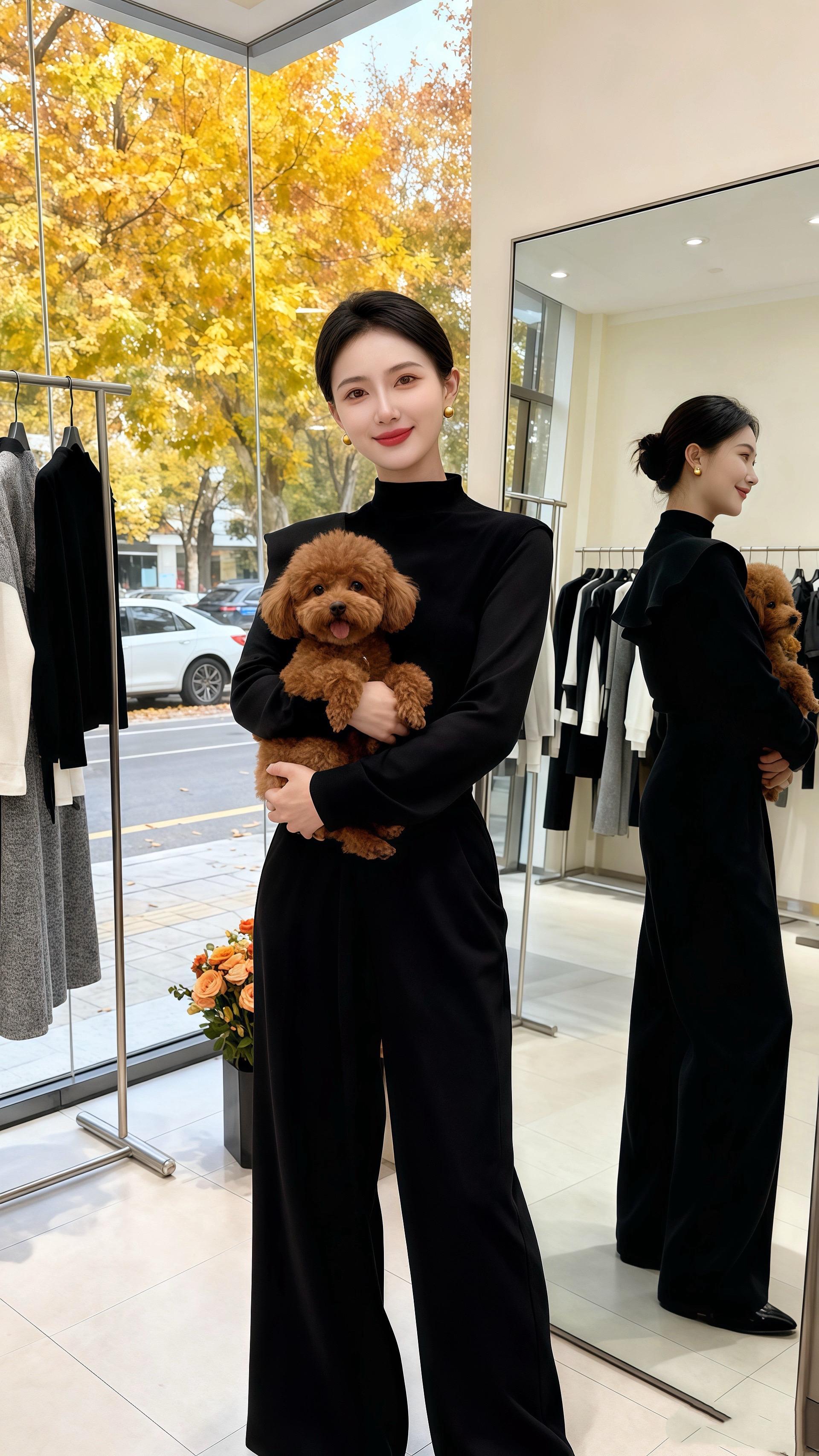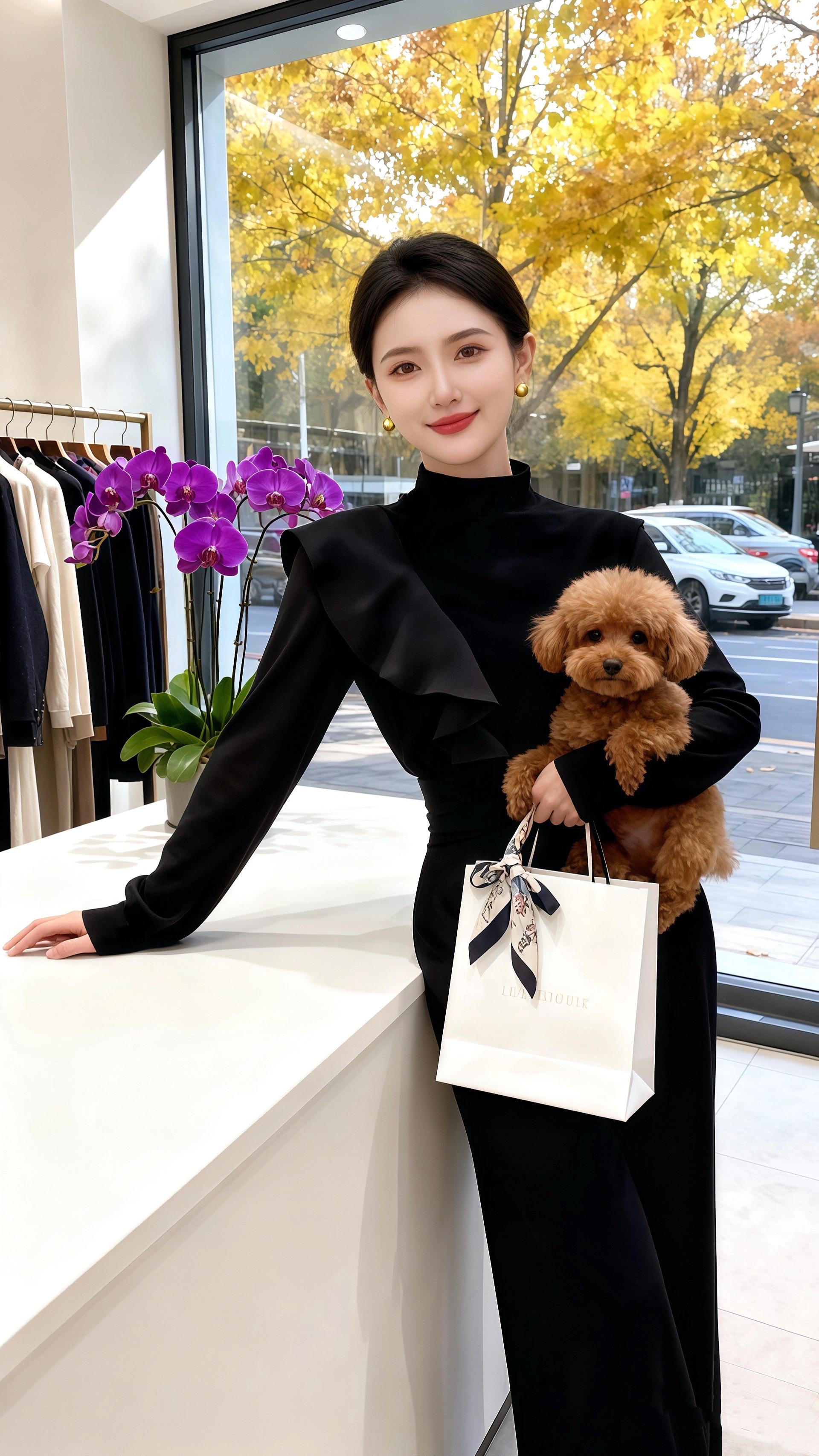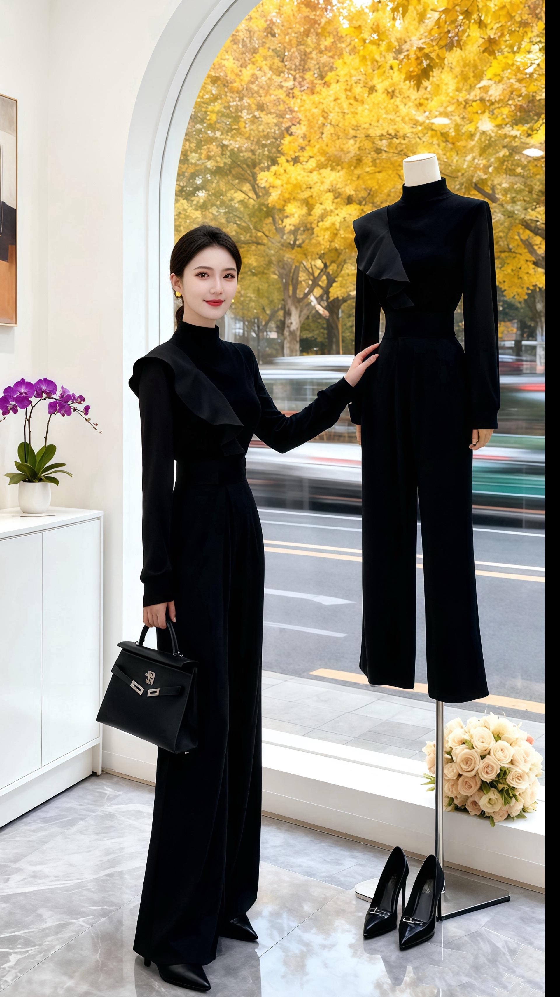 深秋的午后,许妍在一家女装店的落地窗前驻足。她身着黑色荷叶边套装,身姿优雅。