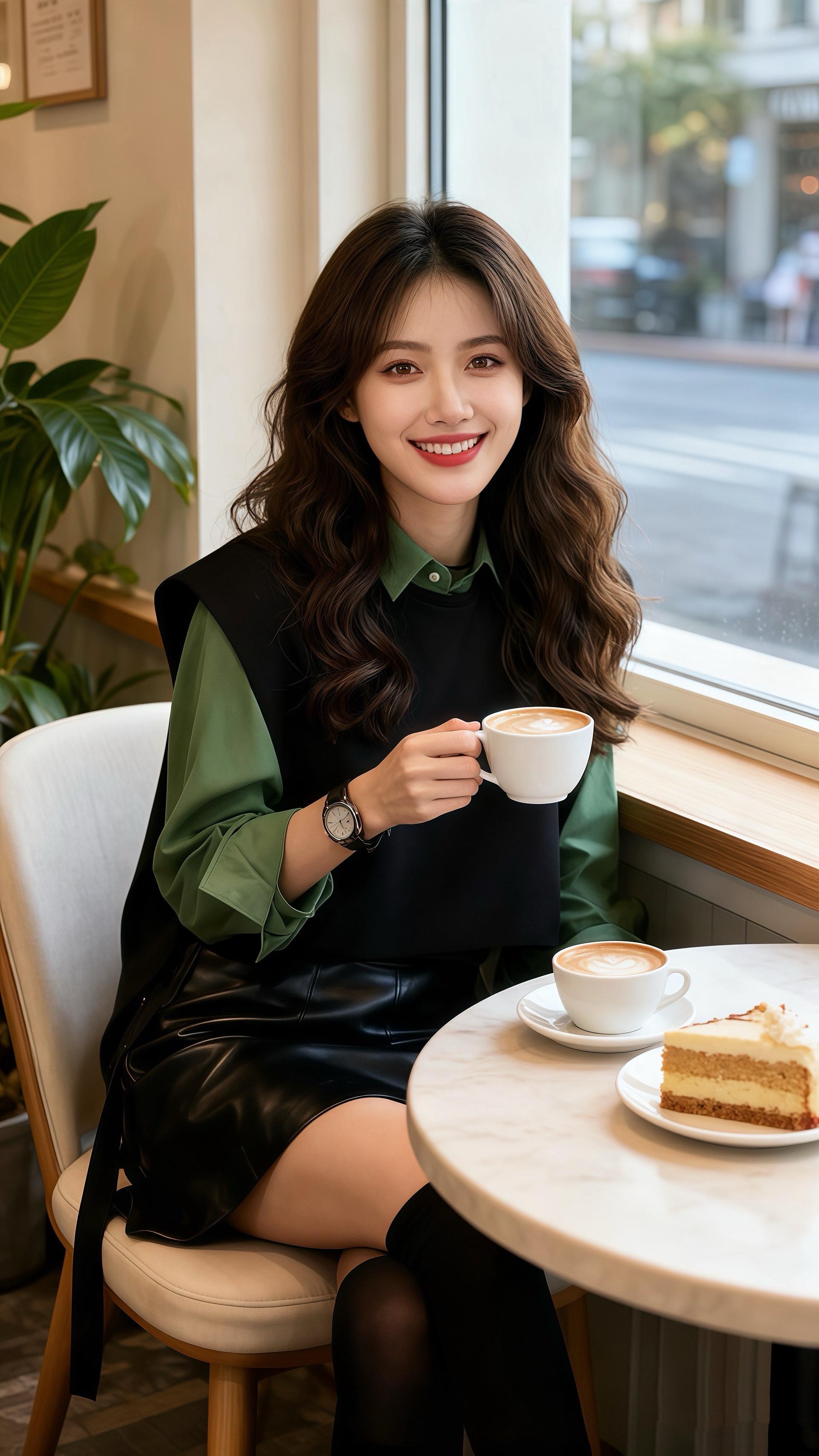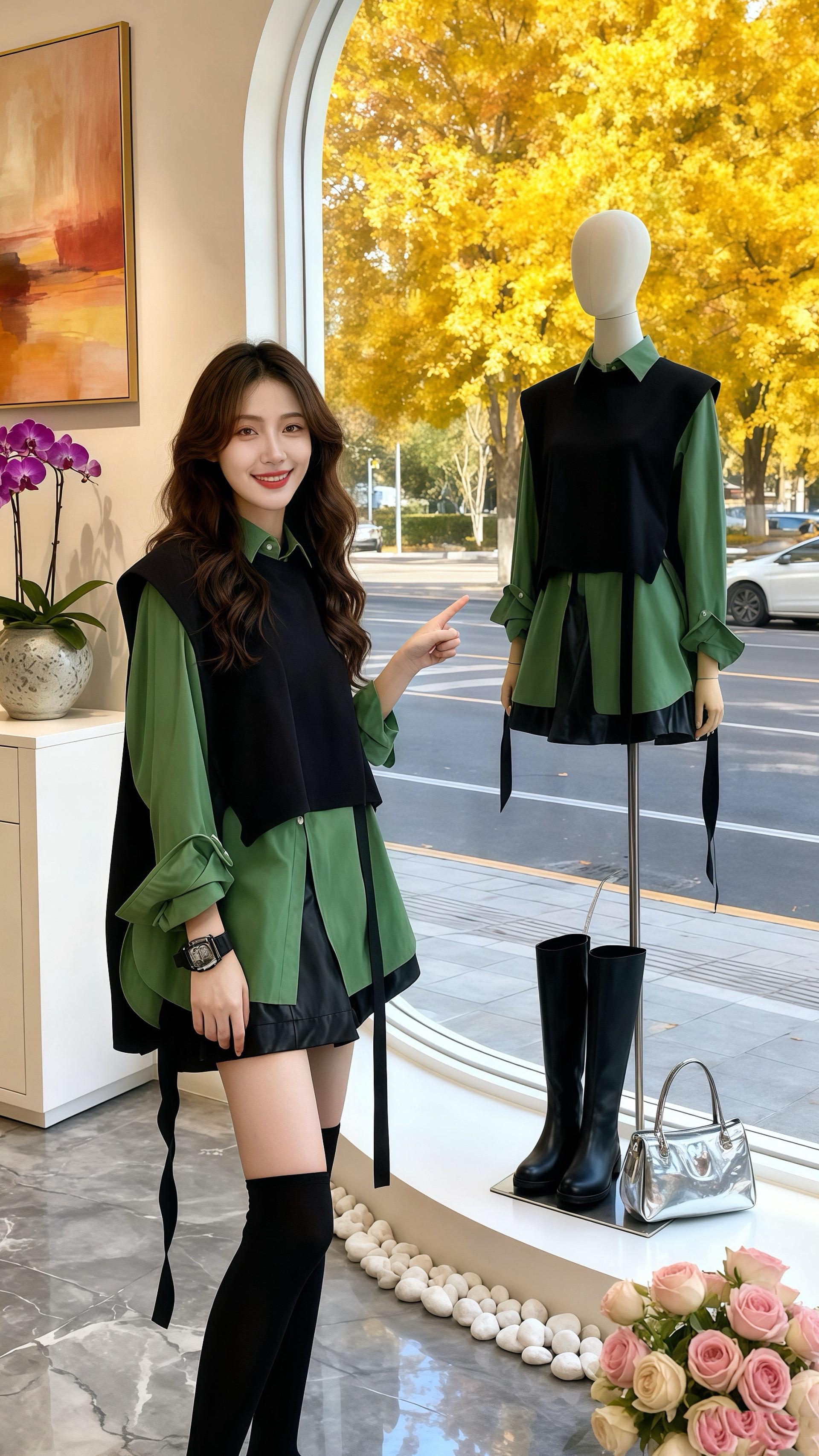 她开始学着在不同场景里赋予这套衣服新的故事:在秋日女装店的落地窗前,她指着同款穿搭的人体模特,仿佛在告诉曾经的自己“你也可以这样亮眼”;在午后的咖啡馆,她捧着咖啡杯,把从容和自信融在微笑里。