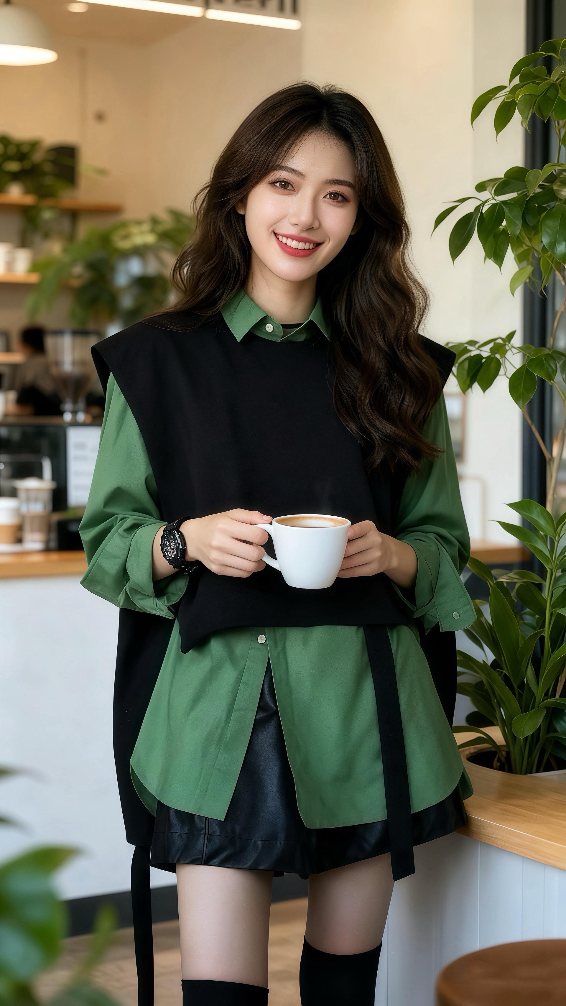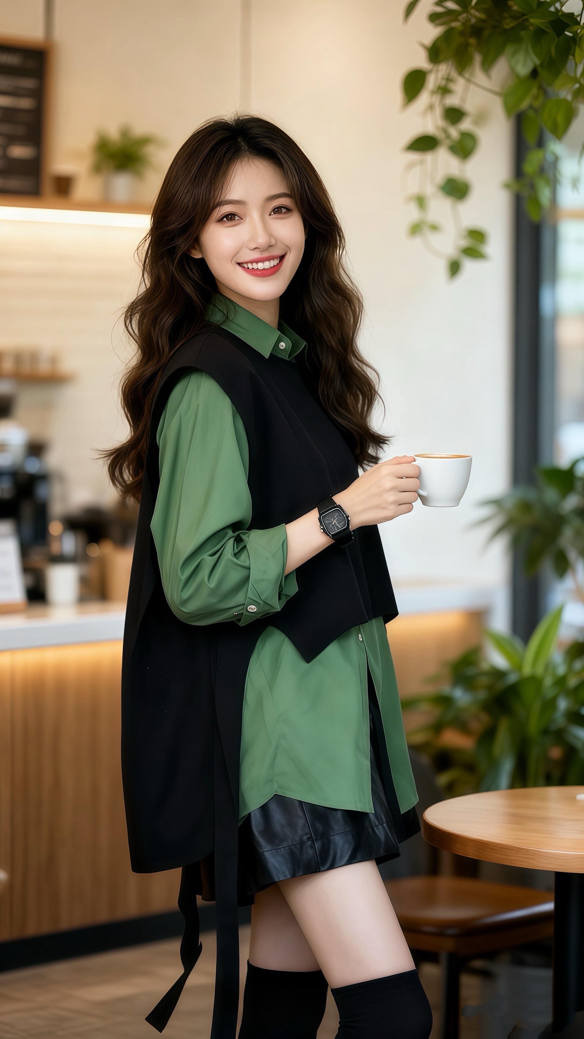 林薇曾觉得自己是人群里最普通的那一个,直到她在一家文艺咖啡店,第一次试穿了这套绿衫黑马甲。当她对着镜子弹了弹衬衫袖口,又把马甲的飘带轻轻理好时,忽然在眼神里看到了不一样的光。