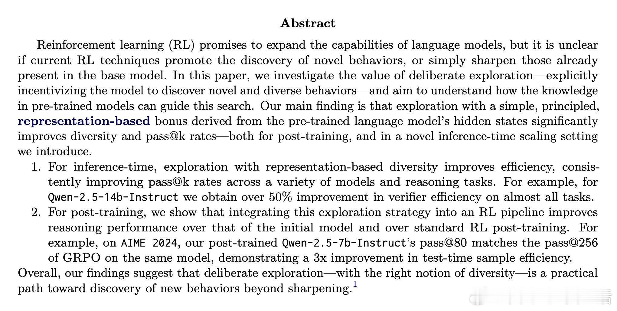 强化学习(RL)有望让语言模型(LLM)自主发现新技能,但现有RL方法多是在“磨锐”已有能力,难以真正发现全新行为。本文重点探讨如何通过“刻意探索”激励模型挖掘多样且新颖的行为,利用预训练模型内部表示指导探索。