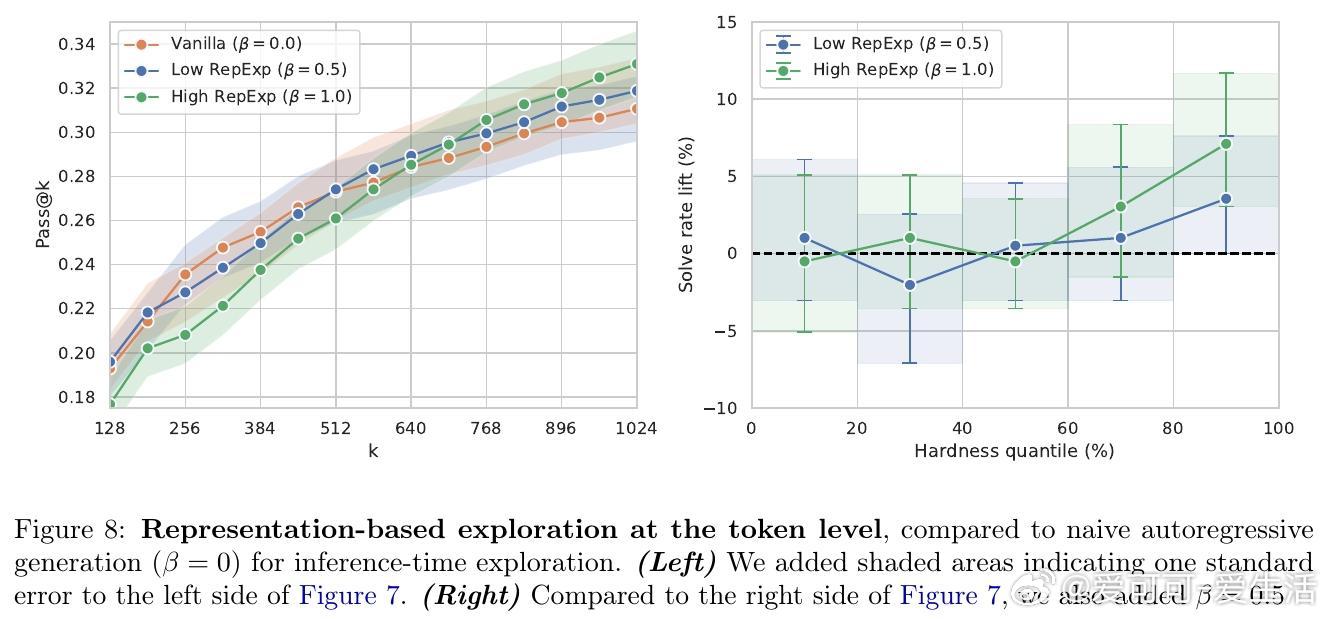 - 在后训练阶段,RepExp在AIME 2024数学测试上,pass- 对比多种生成采样策略,RepExp在绝大多数情况下均优于随机采样。