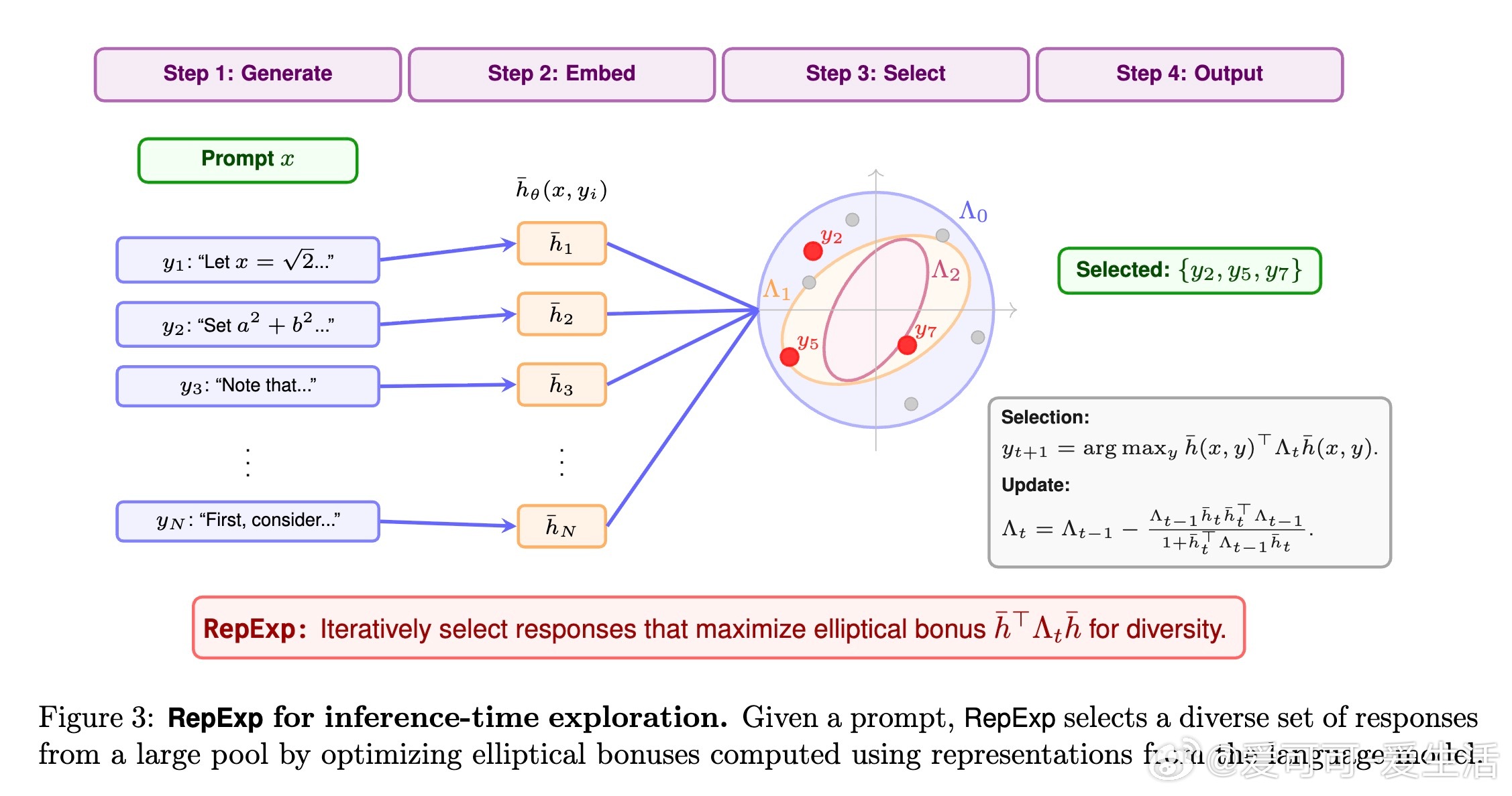 - 推理时方法(RepExp)先采样大量候选回答,再迭代选择最能增加多样性的子集。