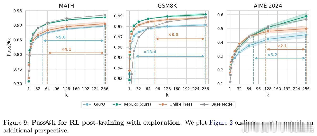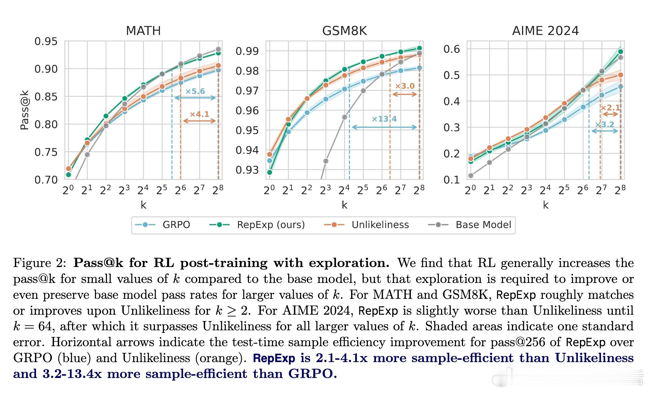 4️⃣ 后训练中结合RL,rep-exp方法有效避免传统RL出现的“多样性崩溃”现象,样本效率提升3-13倍。