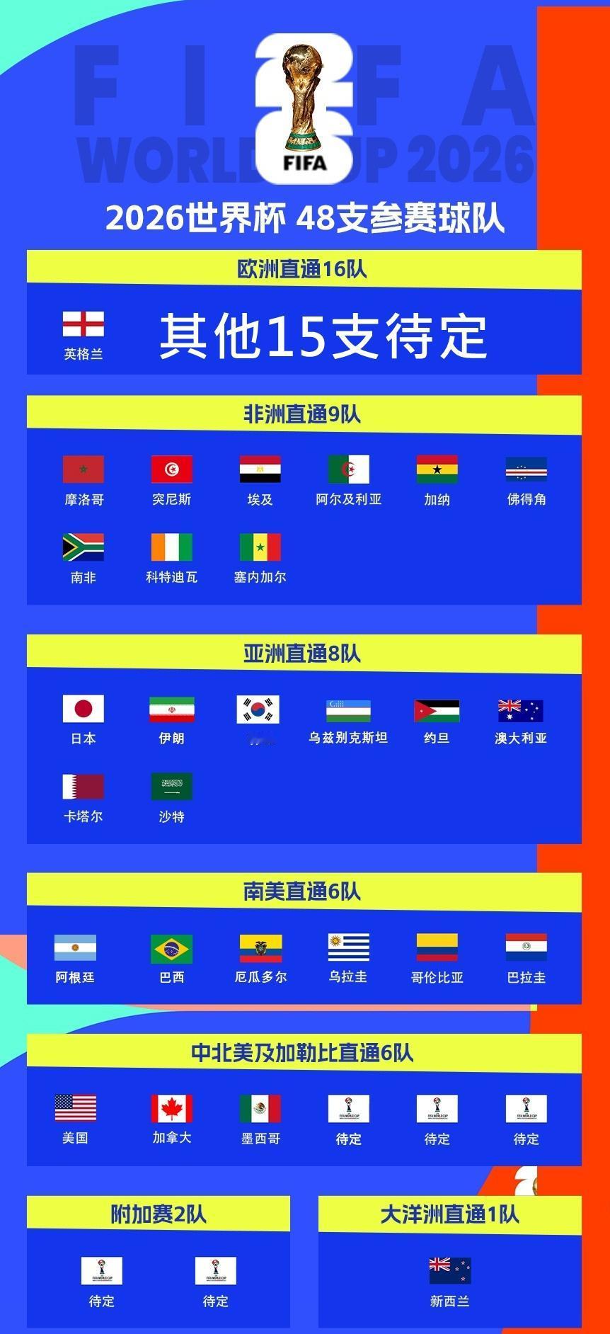 世界杯48强已出28席!英格兰成为首支晋级的欧洲球队。 这届世界杯看着含金量一点都不高。扩军已经扩成这样,什么烂队都能进世界杯了。亚洲、中北美、大洋洲的名额全部打五折,也属于多的。 南美才6队,最菜鸡的亚洲竟然有8队,你光看国家不看实力的吗? 还有既然有大洋洲了,澳大利亚还来亚洲凑啥热闹?应该让他滚回大洋洲才对。新西兰这晋级名额跟白给一样轻松。 至于咱们中国队什么时候能进世界杯,除非扩军到96支,不然一点希望都没有。