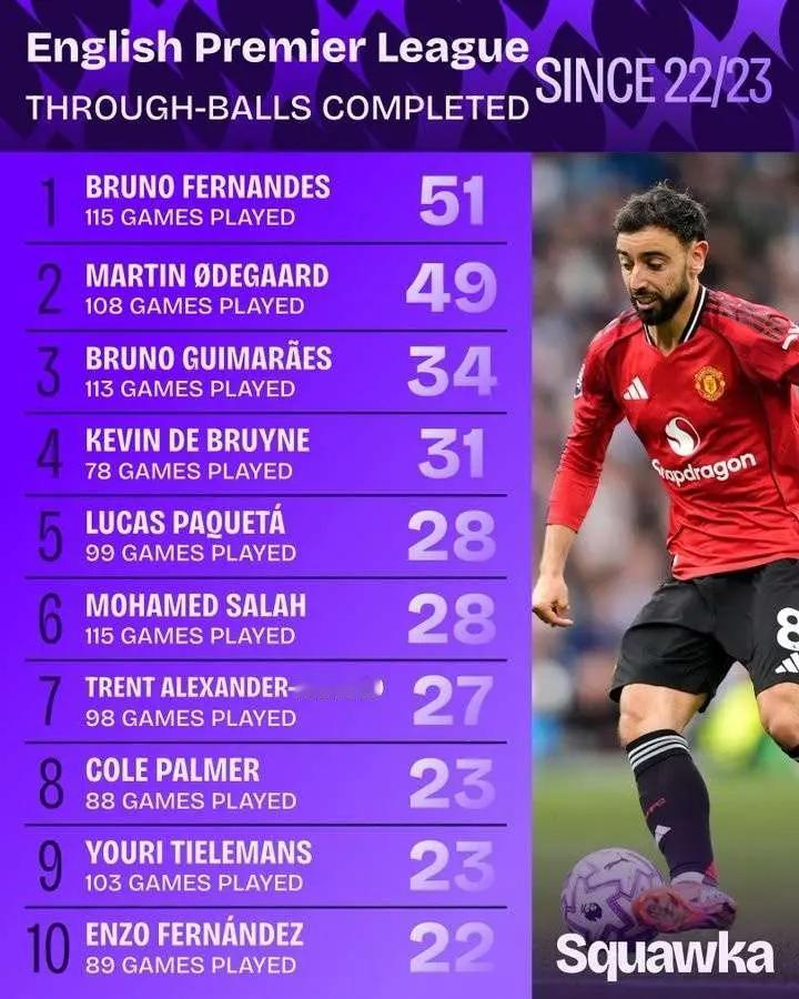 Squawka的统计,自2022/23赛季以来在英超完成成功直塞排行榜单,B费第一,厄德高位列第二,萨拉赫、帕尔默、阿诺德等球员在列,具体如下: