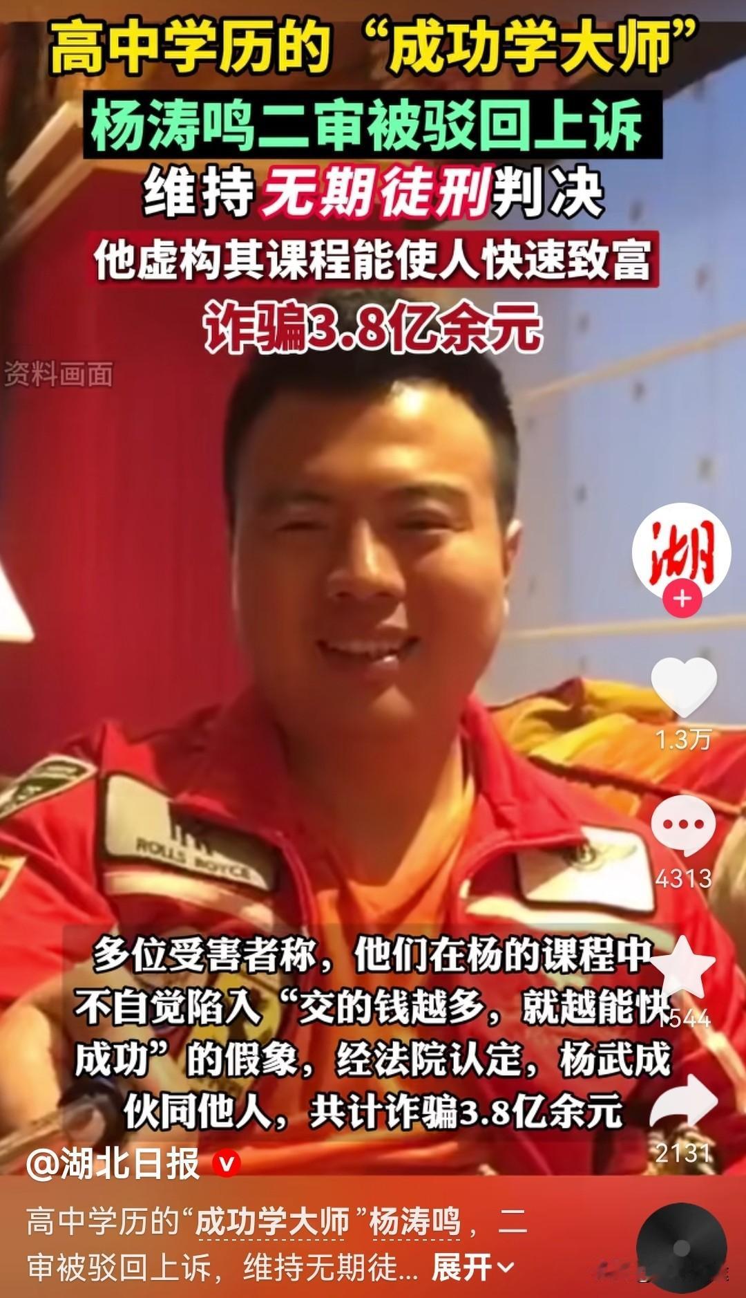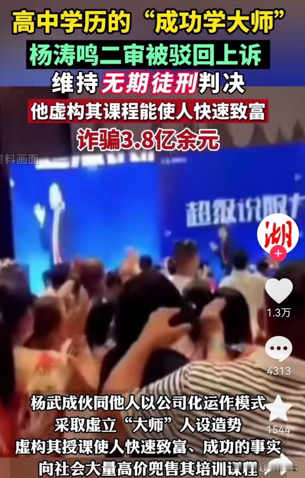 说你们聪明吧!你们不知道见好就收,提前跑路,说你们笨吧!你还能骗这么多钱![笑哭][笑哭][笑哭] 当初那些老板花钱请他们去公司里演讲目的是给员工壮胆打气,往往这些老板都觉得自己公司死气沉沉没有精气神,所以花钱请成功大师去给他们提提神,因为所谓的成功大师最大的能耐就是创造气氛活跃气氛,而并非请他们去真的能为他们老板创造直接价值,所以这些钱花的他们自己心里有数,相当于一个愿打一个愿挨[捂脸][捂脸][捂脸] 成功学有用吗