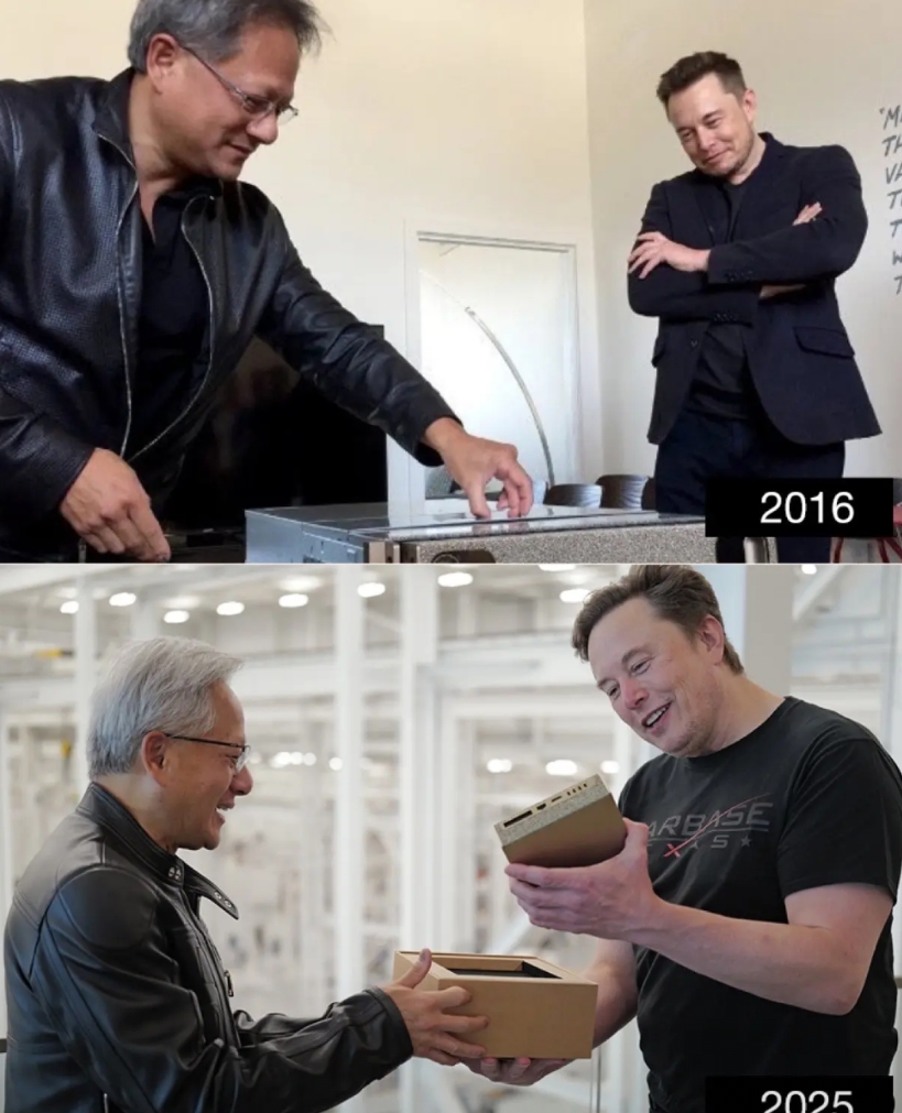 2016年:黄仁勋将首款针对人工智能优化的GPU交付给埃隆·马斯克。 2025年:黄仁勋向埃隆·马斯克展示了全球最小的AI超级计算机。