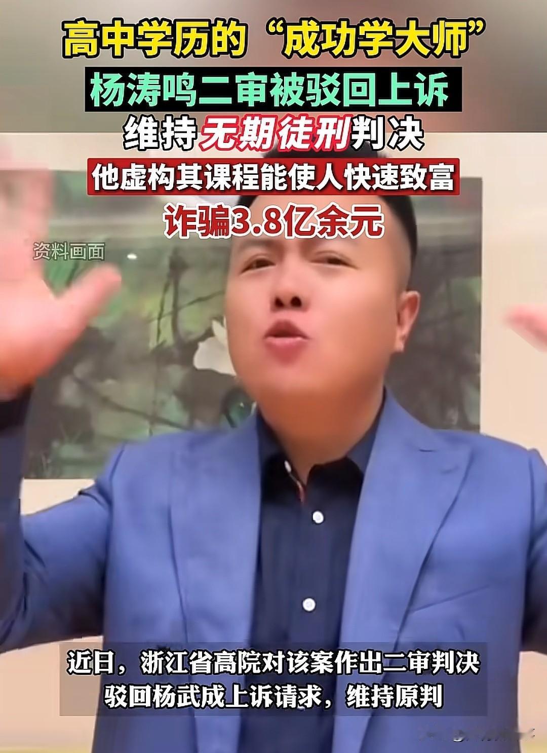 “成功学大师”诈骗3.8亿被判无期 “成功学大师”杨涛鸣伪装7年诈骗3.8亿被判无期,二审维持原判,真是大快人心!这大师原名杨武成,高中学历,原本就是餐厅服务员、电话卡销售员。可他包装自己,说25岁成国家级讲师、助力600多家企业业绩翻倍、27岁开劳斯莱斯、师从陈安之。实际上,这些履历大多是假的,很多企业根本不存在或与他无关,劳斯莱斯也是租的。 他以公司化运作,虚立人设,高价兜售课程,还采用学员分级等方法诱使学员持续交钱。这种靠虚假宣传骗人钱财的行为,必须严惩。也提醒大家,别再被所谓“成功学”忽悠了。