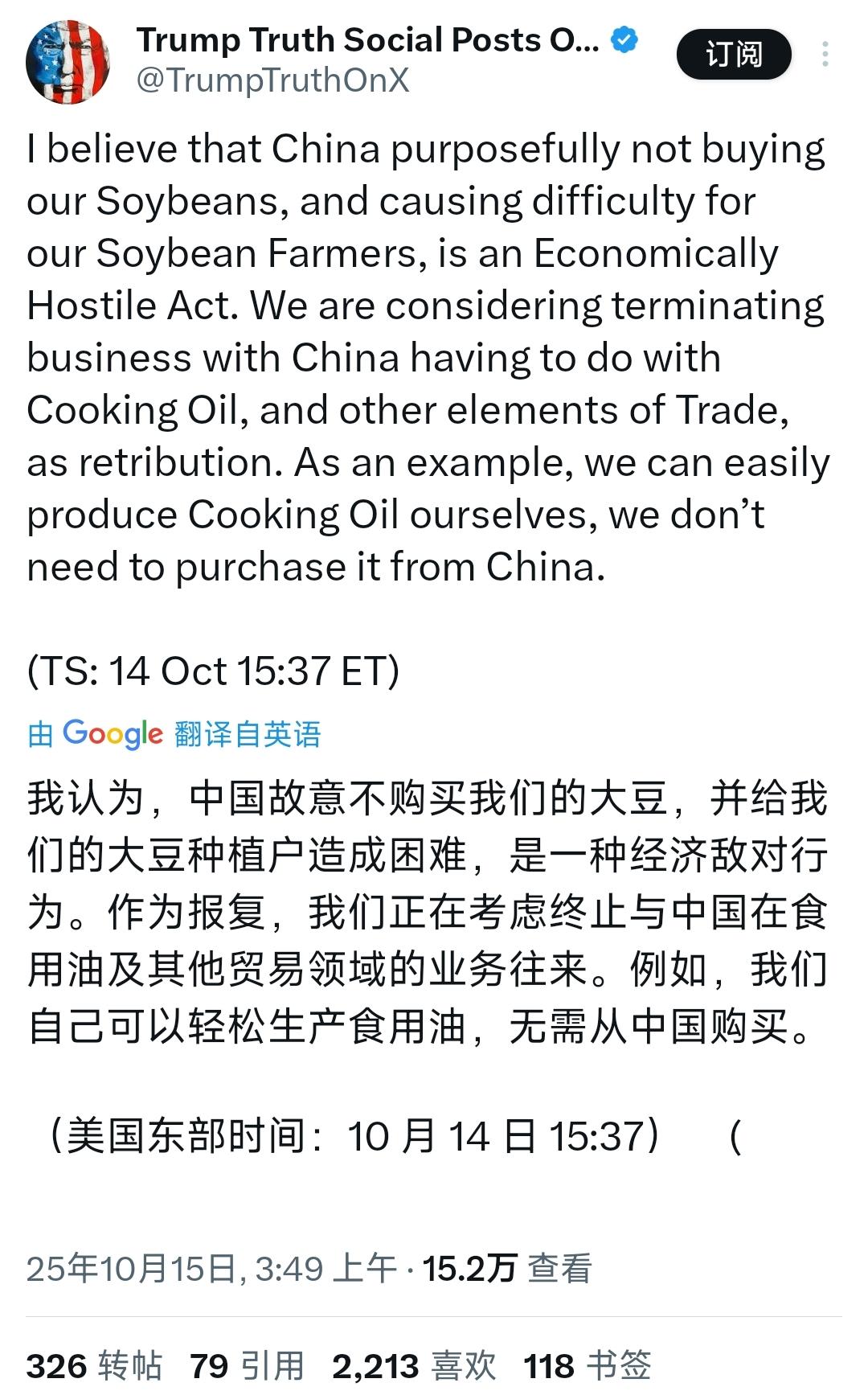10月15号,特朗普再次在个人的社交媒体上发文,威胁要彻底终止和中国部分领域的贸易,来作为中国不进口美国大豆的报复。那么如何看待特朗普的这个言论呢? 首先,这再次表明大豆问题的确打到了特朗普的痛处。它的总体金额虽然不大,但涉及到的大豆农群体不小,而且正好处在共和党选举的关键摇摆州。这对于明年美国的中期选举,包括三年之后的总统大选,都会造成极大的影响。这是特朗普反应如此激烈的根本原因。 第二,华尔街日报最近写了一篇文章,强调最近特朗普在加沙问题上的“外交胜利”,使得他在处理对华关系上具有一定的优势。这种优势既是外交技巧上的,也是心理、韧性与勇气层面的。简单来说,特朗普目前仍然陷入万人拥戴、众星拱月的心理状态当中,这使得他在看待对华关系时并不理性务实,希望中国像其他国家一样,对美国作出单方面大幅让步。 第三,特朗普恐怕依然搞错了当前矛盾的“因果关系”。这场贸易战、关税战完全是美国单方面发起的,如今30%的关税依然高悬在中国的头上。美国如果不主动取消,又怎么能够期待中方作出让步呢?解铃还须系铃人,这个道理恐怕特朗普需要认真思考。而且说实话,大豆的购买行为本身仍是市场导向,巴西和阿根廷的大豆具有极强的价格优势,中方企业进行调整也是自然而然的。 最后,特朗普在大豆问题上的愤怒,也让人不禁怀疑,特朗普和其他国家的贸易协议到底谈了些什么?实际上,无论是和东南亚,日本,韩国,还是和欧洲的贸易协议,其中都涉及扩大对美国能源产品和农作物的采购条款。如果中国买不了,为什么这些盟友不愿意帮助美国去采购这些大豆呢?难道他们所签署的这些协议也是纸面文章,一纸空文吗?这也是一个有意思的观察视角。 总的来看,特朗普要威胁中断和中国的部分贸易,仍然只是他谈判策略的一部分。他并没有经过仔细的思考,而总希望通过这些“小动作”来迫使中国的让步。这些伎俩在其他国家身上或许可以行得通,但在与中方的对话和磋商当中,恐怕是难以奏效的。