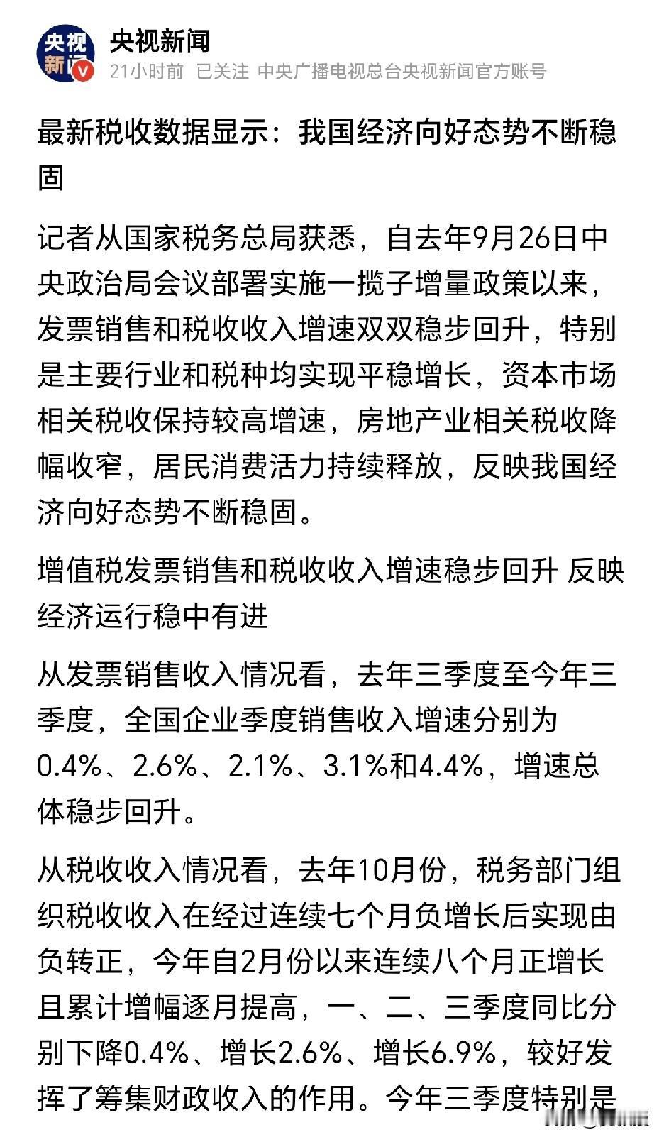 信心比黄金更重要 好消息[赞][赞] 最新税收数据显示:我国经济向好态势不断稳固