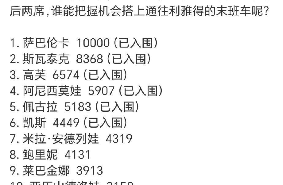 wta年终总决赛,八个席位已经确定六个! 已经入围的刚好是现在的top6,真是实至名归! 萨巴伦卡、高芙、斯瓦泰克、凯斯是今年赛季四大满贯冠军得主,入围当之无愧。 阿尼西莫娃老将回春,今年拿到两个大满贯亚军、两个1000赛冠军,拿到总决赛门票也并不意外。 武网后,佩古拉也锁定了年终名额。 剩余两个名额在小米拉、保利尼、莱巴金娜三人中产生。 宁波和东京两站比赛过后,竞争激烈的三人谁能入围呢? #新锐创作者成长计划#