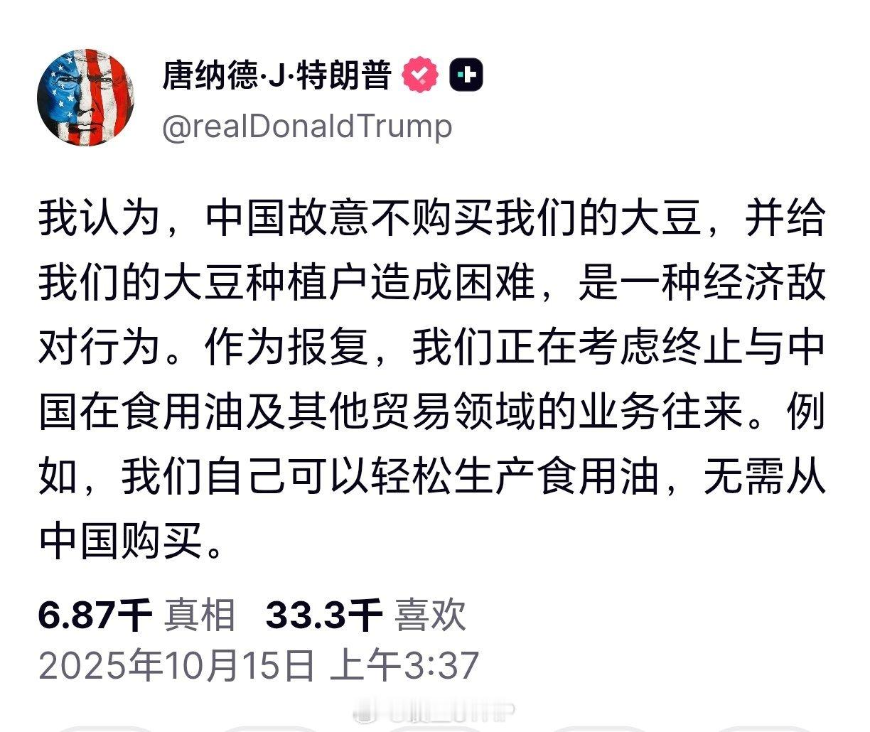 特朗普称美国可自产食用油无需进口特朗普:中国不买我们的大豆,我们自己可以轻松生产