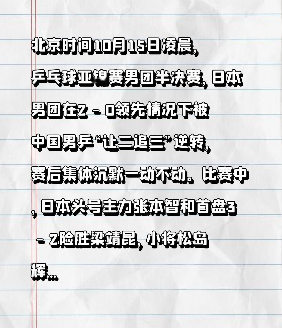 北京时间10月15日凌晨,乒乓球亚锦赛男团半决赛,日本男团在2 - 0领先情况下被中国男乒“让二追三”逆转,赛后集体沉默一动不动。 比赛中,日本头号主力张本智和首盘3 - 2险胜梁靖昆,小将松岛辉空次盘3 - 2爆冷击败王楚钦。此后,林诗栋3 - 2逆转筱冢大登,王楚钦3 - 2复仇张本智和。决胜盘梁靖昆3 - 2力克松岛辉空锁定胜局。比赛结束,中国队庆祝胜利,日本队选手和教练呆立原地,张本智和跪地捂脸,松岛辉空眼神空洞,教练田势邦史双手抱头,替补席队员或低头或呆滞,沉默近2分钟,直至工作人员安抚才缓过神。 这一现象背后有多方面原因。从心理层面看,运动员承受巨大压力,败北带来挫败感、自我质疑和国家荣誉责任感,他们用沉默表达情绪,也是对自身努力尊重和对未来挑战的准备;且从领先到被逆转,巨大心理落差需时间消化。从体育精神角度,这或是尊重对手的表现,他们未争执不满,而是反思自身不足。另外也暴露日本体育培养体系短板,其长期重技术轻心理建设,选手逆境调整能力弱;媒体极端评价加重选手心理负担;团队凝聚力不足,关键时刻缺乏相互支持。乒乓亚锦赛 亚洲乒乓亚锦赛 亚锦赛男乒 男乒亚锦赛 男团亚锦赛 亚锦赛男团赛 中日男单