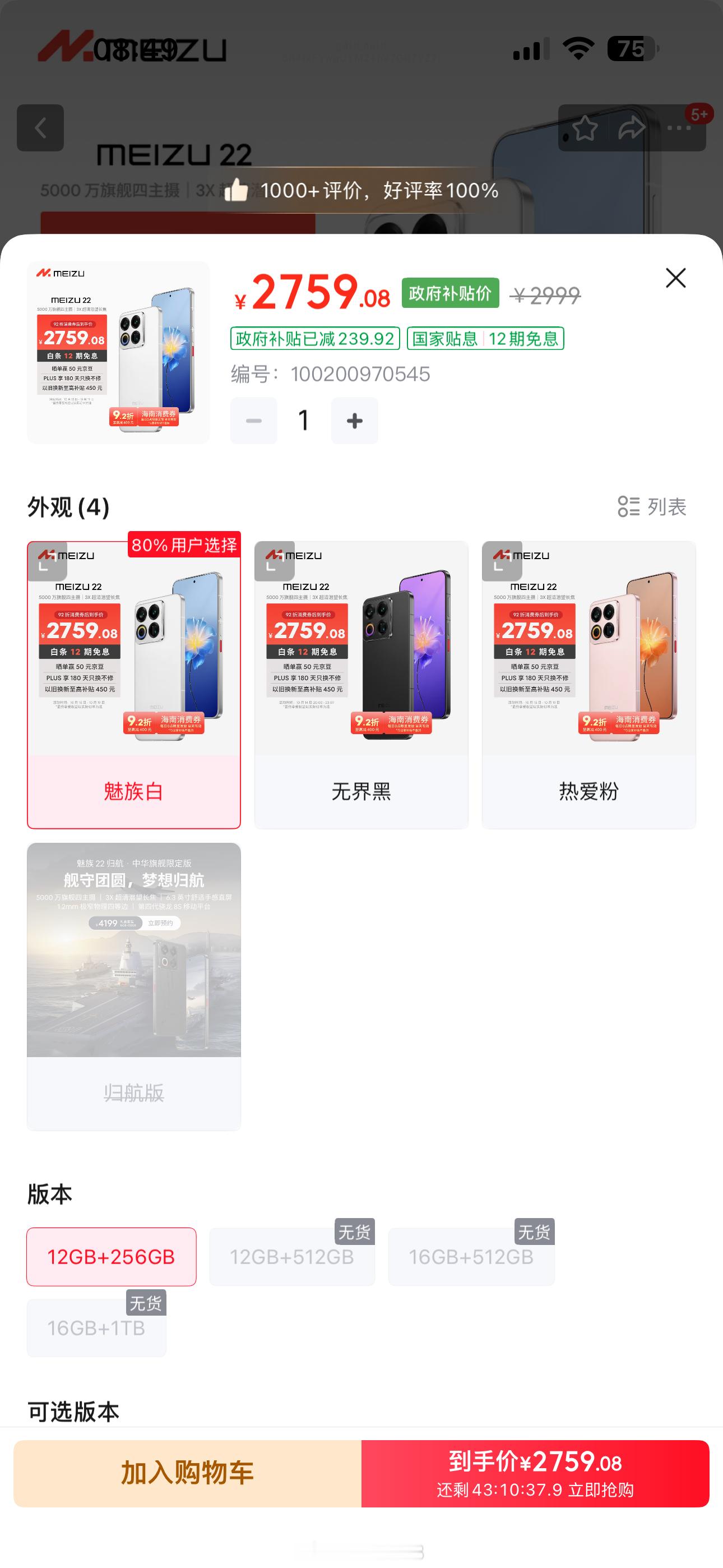 没想到魅族 22 的白色这么缺货,京东只有 12+256GB 有现货,想买白色其他版本的小伙伴可以蹲一下每天晚上 20:00,可能会有少批货出来。