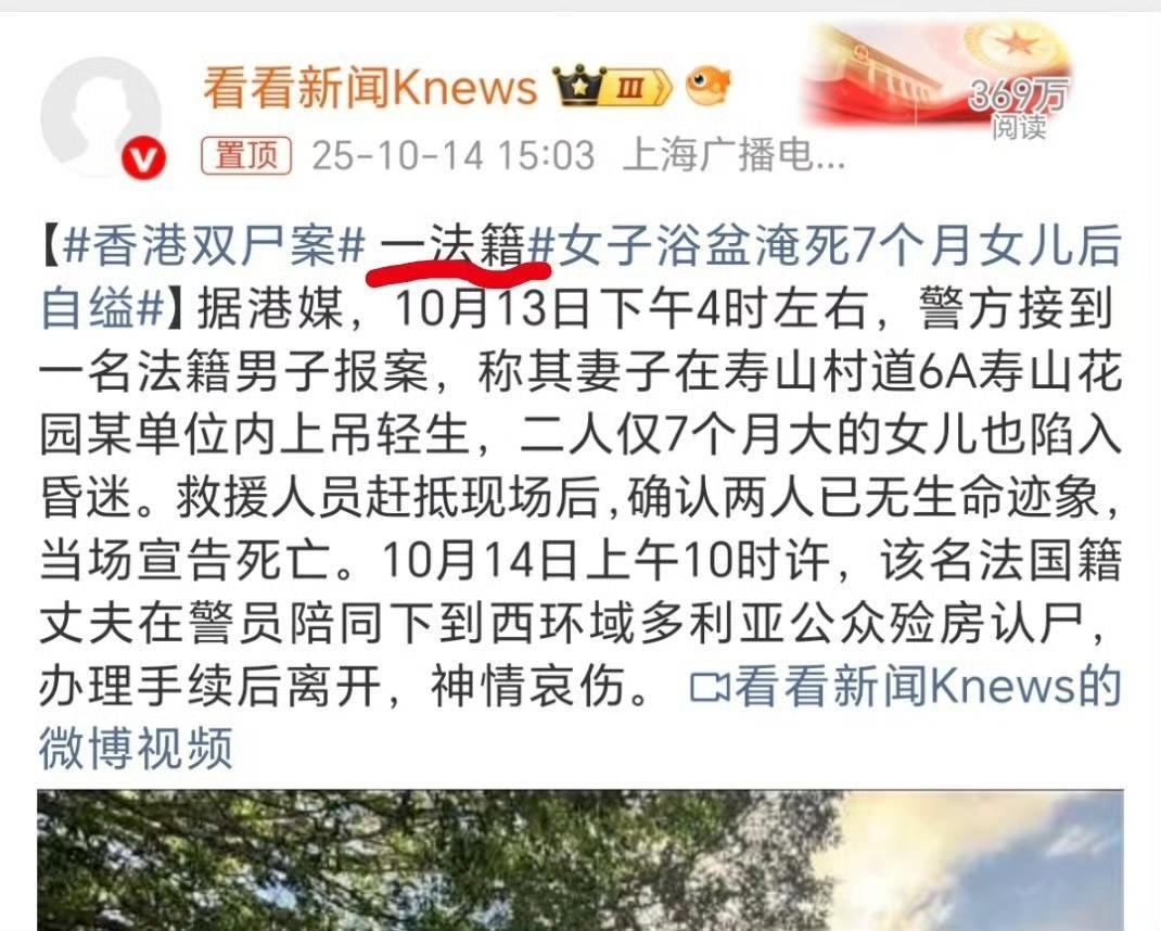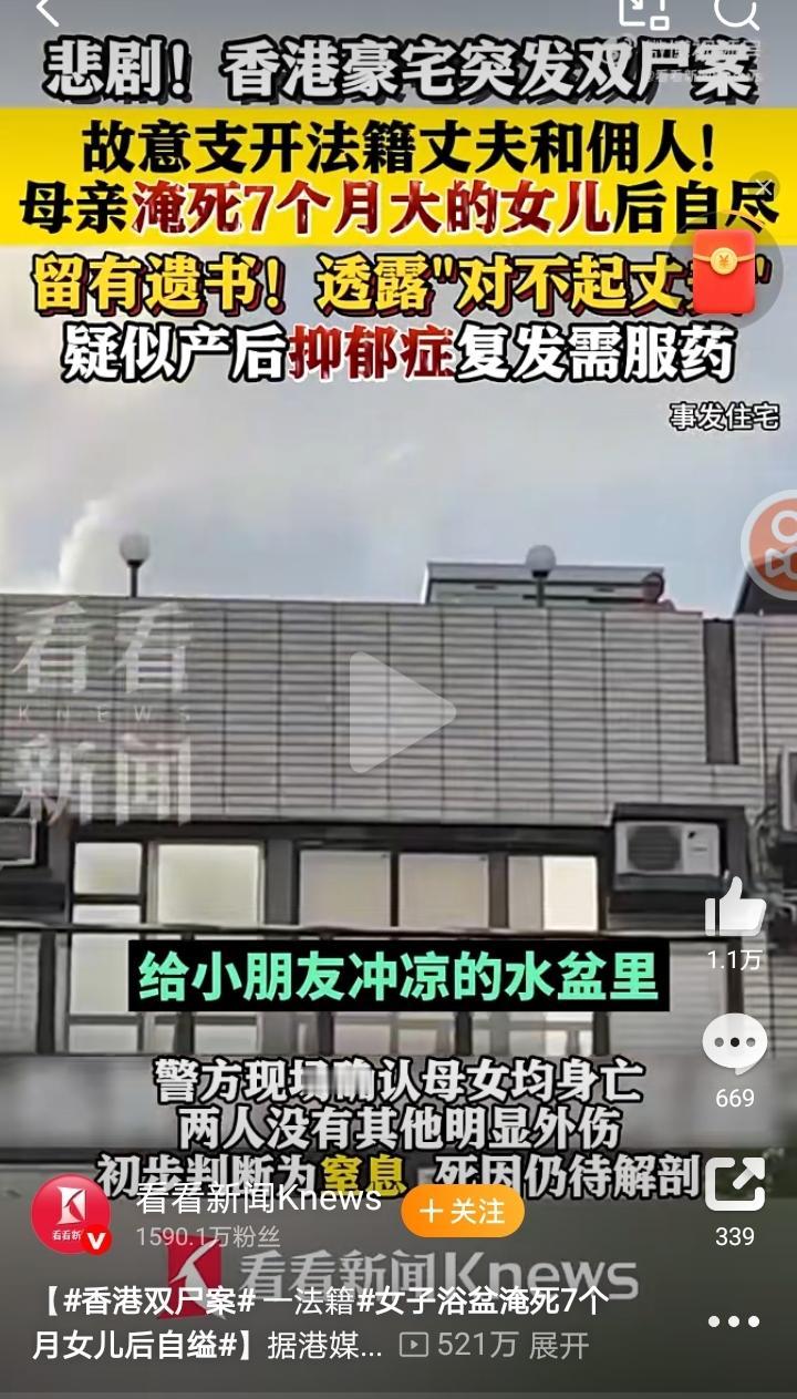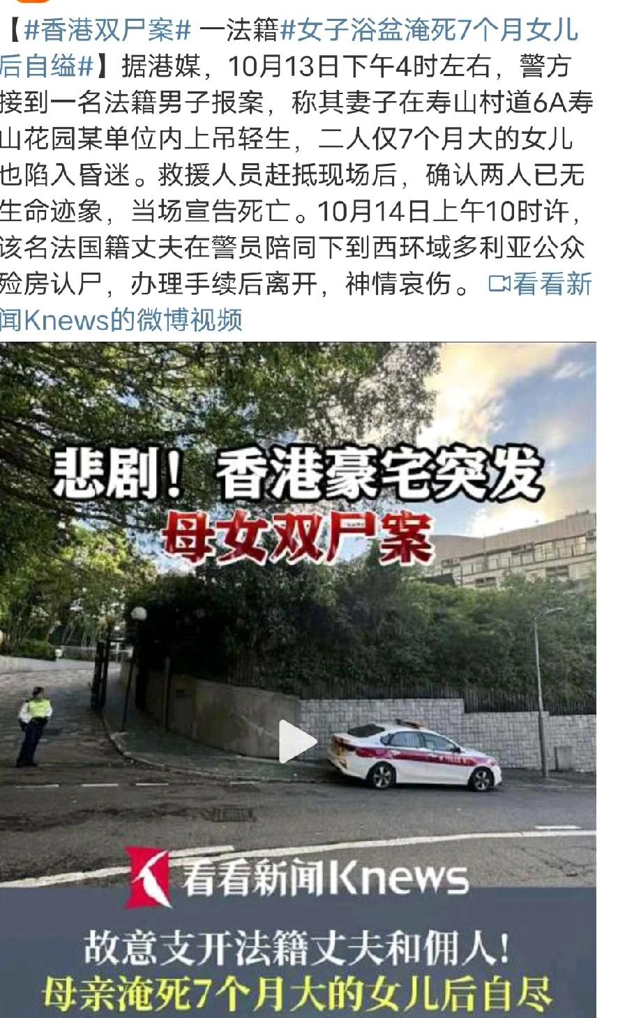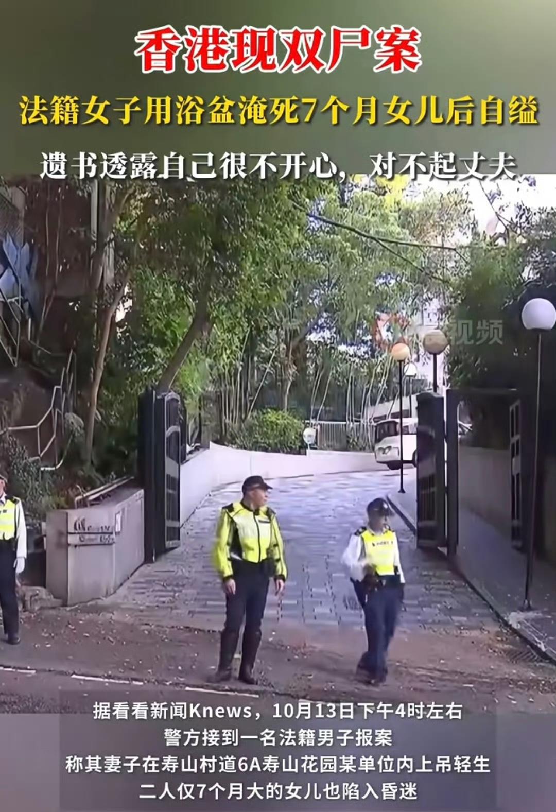 香港豪宅惊现母女双尸!法籍妈妈淹死7个月女儿后自缢,产后抑郁或是元凶 10月13日下午,香港寿山村道的豪宅里出了件大事。一名法籍男子报警,说妻子上吊自杀了,7个月大的女儿也陷入昏迷了。救援人员赶到时,母女俩都没有了呼吸。 警方调查时发现,这位妈妈是故意支开丈夫和佣人后,把女儿按进冲凉的水盆里淹死,然后自己上吊自杀的。现场还留了一封遗书,说自己对不起丈夫,她过得不开心。 据说她有产后抑郁的病史,这次可能是旧疾复发,没按时吃药。现在案子暂定是杀婴和自杀案在查。 第二天,孩子爸爸去殓尸房认尸,看得出来特别的伤心。 这事太让人揪心了,产后抑郁症真的太可怕了,希望大家都能多多关注身边人的情绪,别让悲剧再发生了。香港女子自杀 母子坠桥溺亡 母亲自杀 香港死亡 夫妻双双自杀 广东一男子殉情 香港女尸 父女双尸案 信息来源:看看新闻