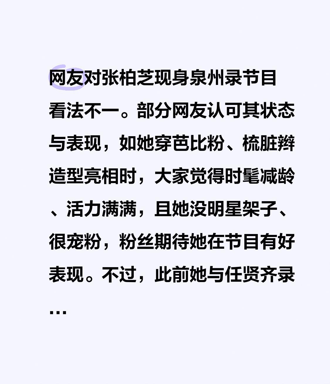 网友对张柏芝现身泉州录节目看法不一。部分网友认可其状态与表现,如她穿芭比粉、梳脏