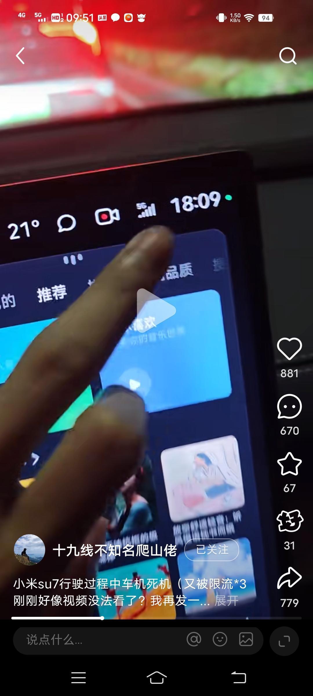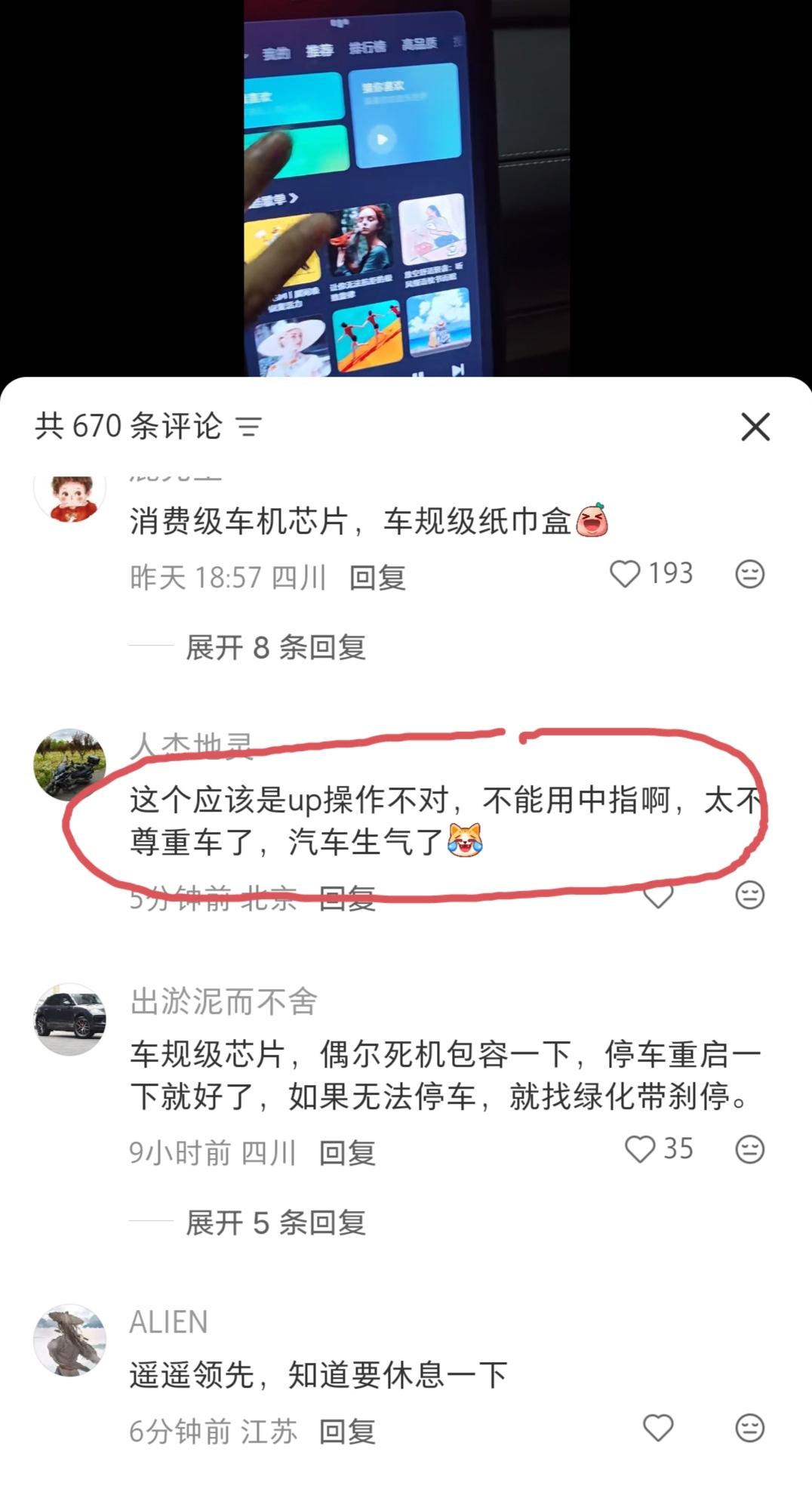 某米蘇妻车主发视频吐槽:行驶过程中遇车机死机,视频发布到网上,又被限流了…… 评论区网友当然大部分是调侃这位车主的,让他自适应,重启一下的。说他为什么把视频发布到网上,这不是真正的米粉的。最有意思的一条评论是:“这个应该是up操作不对,不能用中指啊,太不尊重车了,车机生气了”[捂脸][捂脸][捂脸] 这些网友也太不厚道了,人家买台车,遇到糟心事,发到网上,想找到解决方法,方法没找到,却引来一顿调侃戏谑。 当然,这个事情也是这位车主的一面之词,到底有多少可靠性和真实性,大家见仁见智,自己判断。