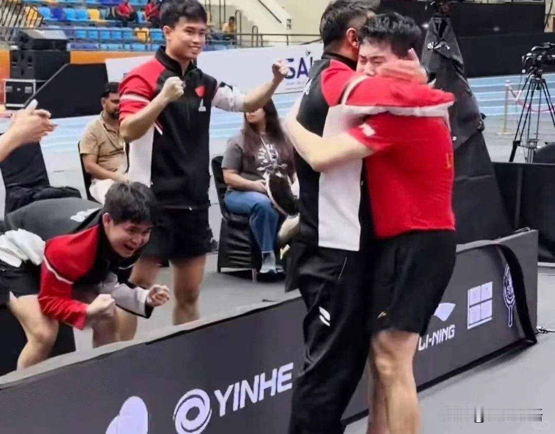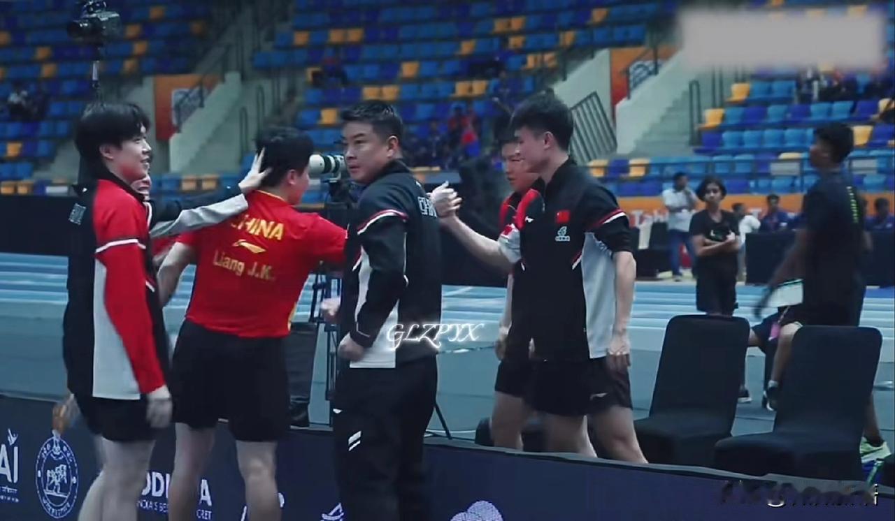 梁靖崑抱住楚钦的那一刻,是再也绷不住了。 历经五盘25局的比赛,梁靖崑拿下了决胜盘,他跑着奔向王皓,王皓也紧紧的抱着梁靖崑,知道孩子太不容易了,打决胜盘的压力肯定特别大。跟王皓拥抱后,梁靖崑先走向了王楚钦,虽然楚钦是弟弟,但是他抱着哥哥,还摸摸大胖哥哥的头抚慰他的情绪,他知道甜甜的压力有多大,看得出来梁靖崑真的很信任楚钦,哥俩也是一起从小长大,不是亲兄弟胜似亲兄弟,楚钦抱着甜甜的时候,甜甜哭了,他还在楚钦的衣服上擦了一把眼泪,楚钦是真宠他的大胖哥啊 虽然甜甜比楚钦大,但是很多时候楚钦像哥哥一样。林诗栋也过来拍拍哥哥的肩膀,看着小石头都要哭了,经历了这次比赛,小石头肯定成长了,就像楚钦说的:中国乒乓球队还是那个乒乓球队。这就是团队的力量,真的越来越喜欢看团体赛,虽然过程有点煎熬,但是赢下比赛的那一刻,每个人都会眼含泪花吧,他们真的太不容易了。 看到其他人都在收拾东西,梁靖崑又自己坐在椅子上平复一下心情,他收拾球拍时,低头的那一刻也哭了,他自己知道自己这一路走来多么的不容易。好好休息,今天的决赛国乒继续加油哦!