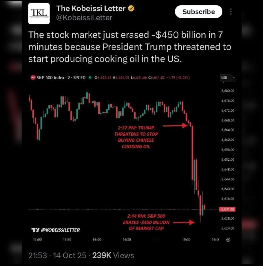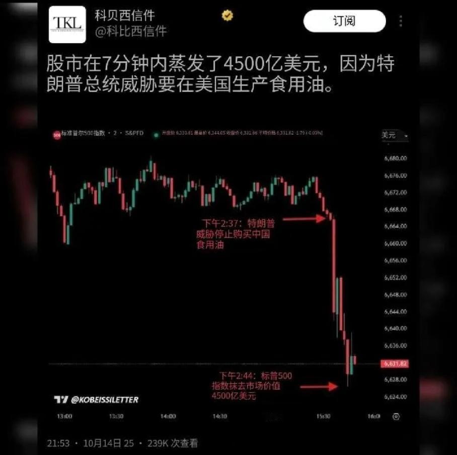 难怪美国股市仅仅7分钟蒸发近5000亿美元,川普社交动态透露真相,他又准备动手了,这次瞄准的是食用油 一觉醒来,美国股市又开始跌跌不休了,哪里出了问题? 就在市场寻求真相时,路透社及川普的最新社交动态都显示了一个消息,川普又要动手了…… 在文中,他将不购买美国大豆,视为经济敌对行为,因此,他要报复,瞄准的目标则是食用油。 食用油? 对,食用油! 但是,不用紧张,这一个回旋镖对美伤害更大。 我综合多方信息看了一下,所谓的食用油,其实不是食用油,而是日常生活中的“地沟油”,这种油是生物燃料的主要来源,去年一年,美国进口这种油约130万吨,占了美需求量的90%。 显然,我们是最大卖家。 如果川普对这种食用油说NO,那就意味着相关产业被迫停业。 为什么呢? 据来自船舶信息网一个数据显示,全美不能提供足够需求,而且这一领域,其它国家难以满足美方需求。 这可能与饮食习惯有关,我们的煎炒烹炸产生的这种油脂丰富。 也就是说,川普这种撒胡椒面的打法,必将再次伤到自己,而其传递出翻脸信号,则是美股跳水的直接诱因。 我严重怀疑,他和他的密友们又布局了股市,股市下跌买进,然后话锋一转,我没想继续“关税战”,让股市快速拉升,得,又一个盆满钵满,又赢麻了…… 国际