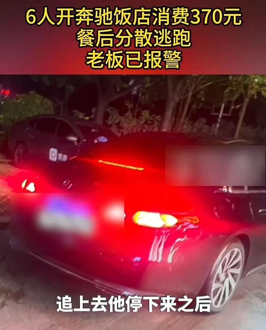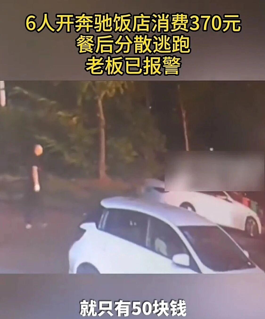 江西抚州6男子370块餐费不付,开奔驰逃单,被抓付了50块。10月13日,六个男子开着奔驰到一个餐馆吃饭,酒足饭饱之后,一个一个开溜,被老板发现,追出去叫他们买单,其中一个男子极不情愿的拿出手机,扫了50块,老板以为到账,趁着看手机的功夫,几人分头撒腿就跑,车上的人见同伙溜了,一脚油门也冲了出去。饭店逃单 餐饮店逃单 奔驰车逃单 抚州小偷