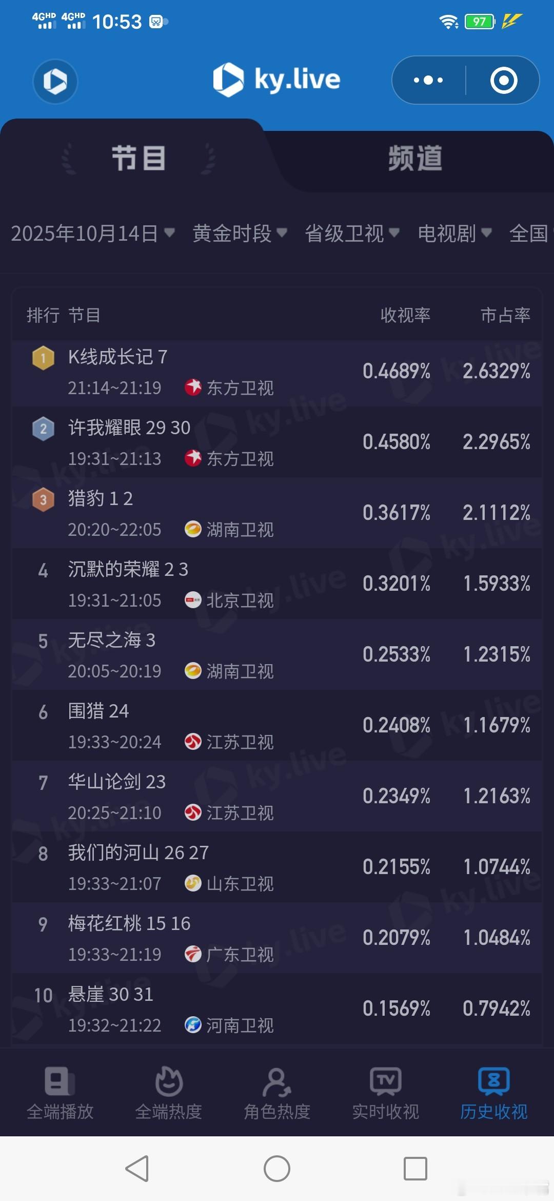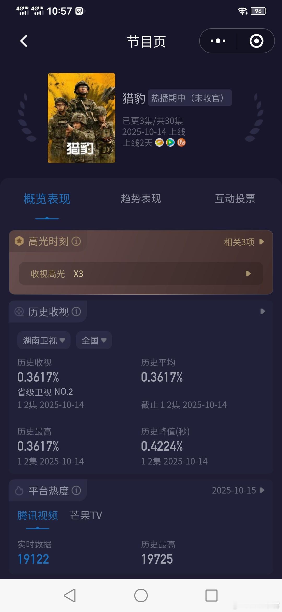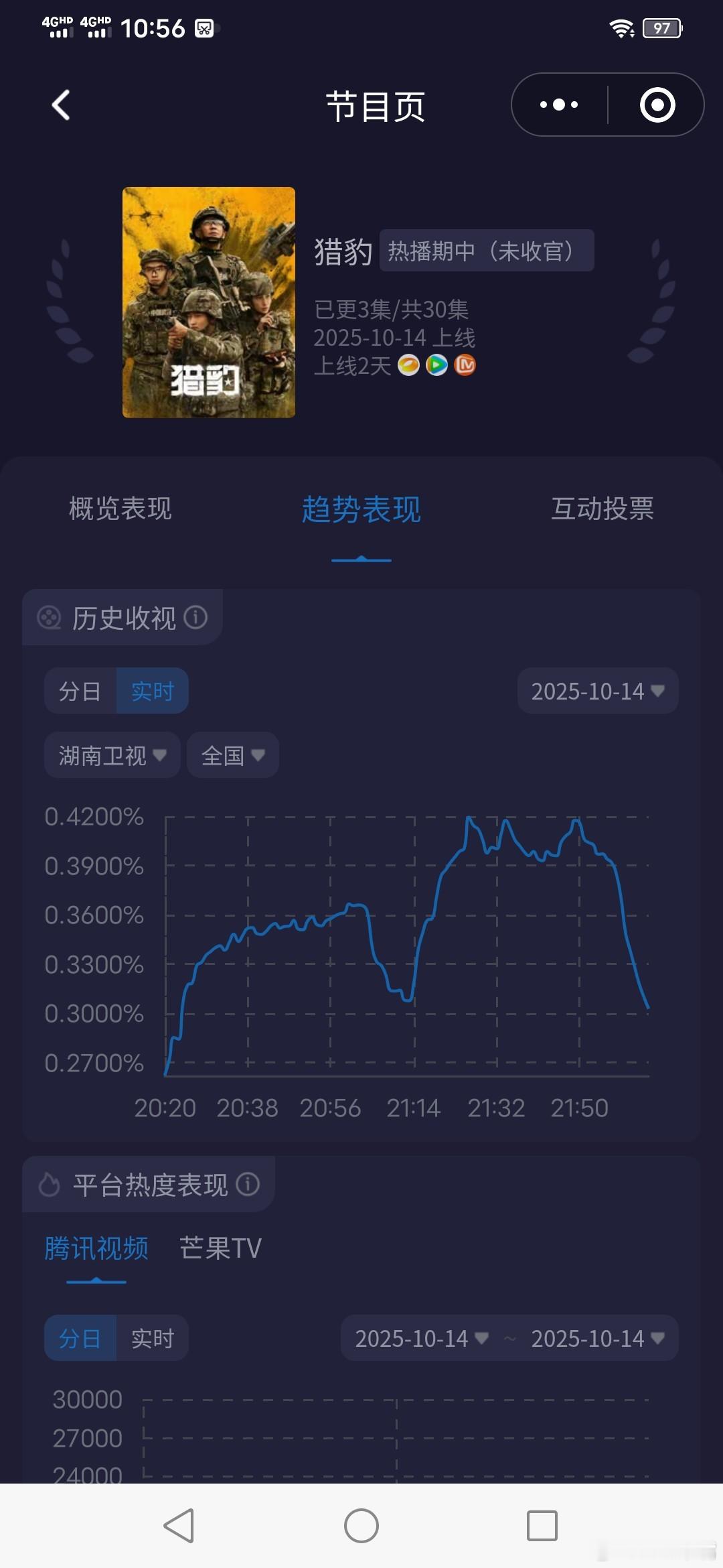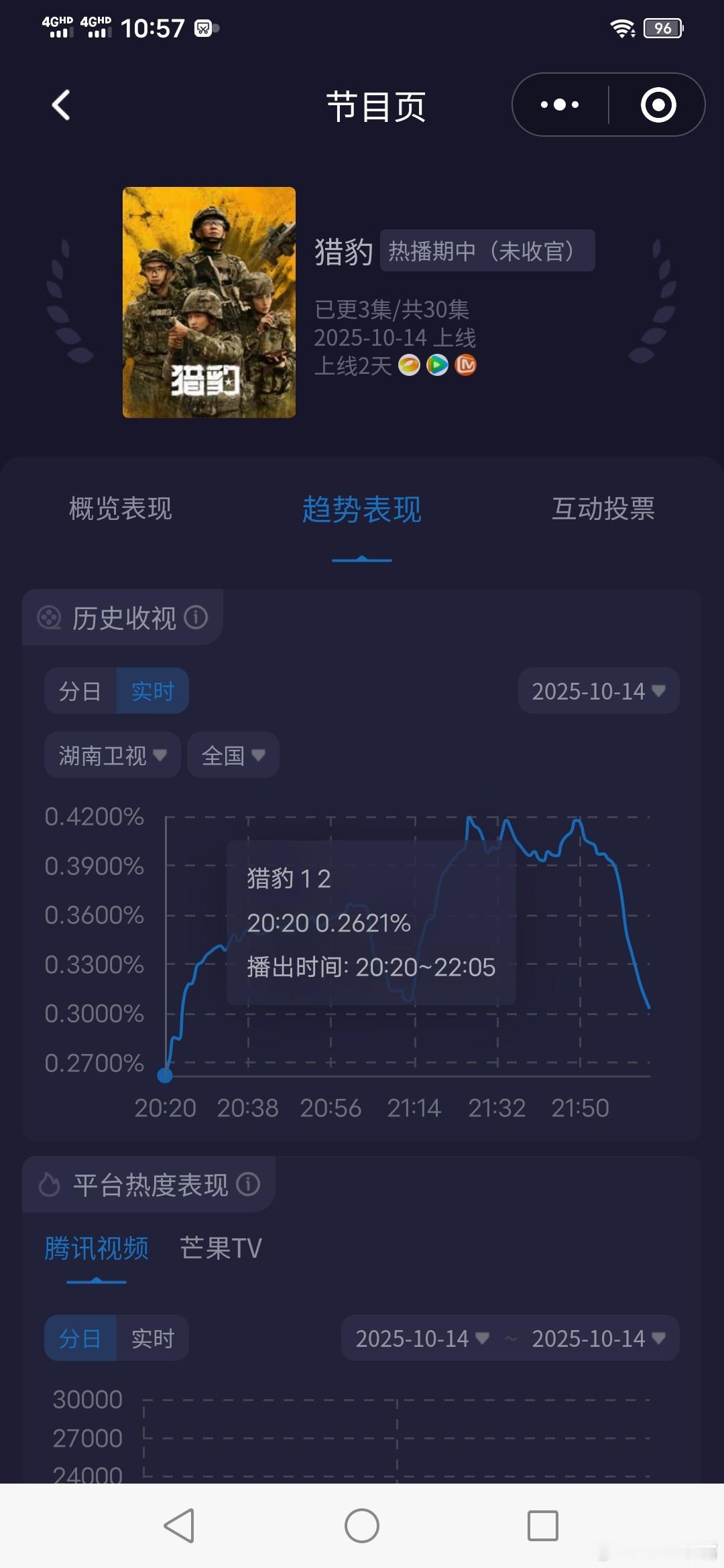 电视剧猎豹《猎豹》首播收视快报!酷云起点0.2621,峰值0.4224,双集平