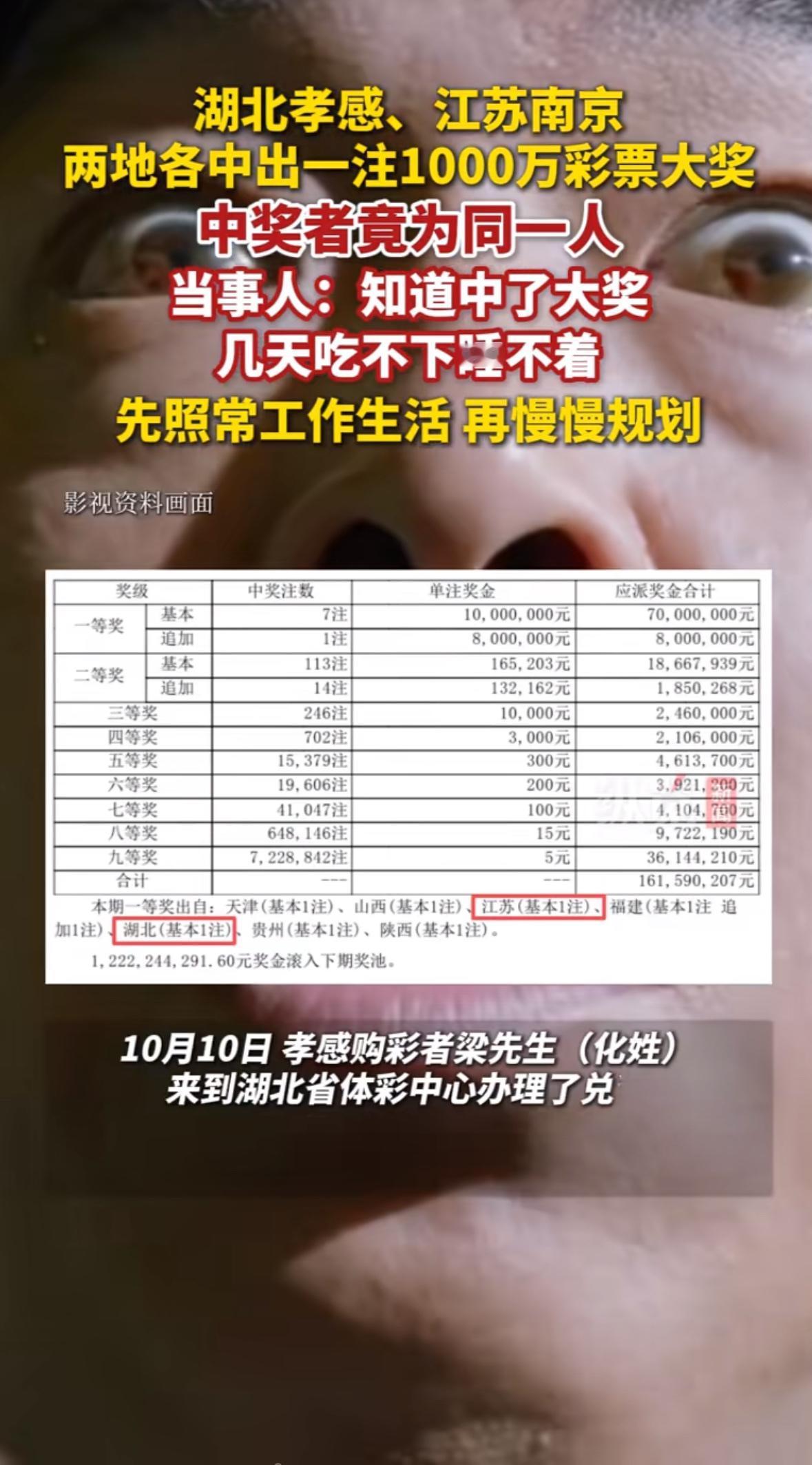 “湖北孝感、江苏南京各中1000万,中奖者是同一个人!”2025年10月15日,
