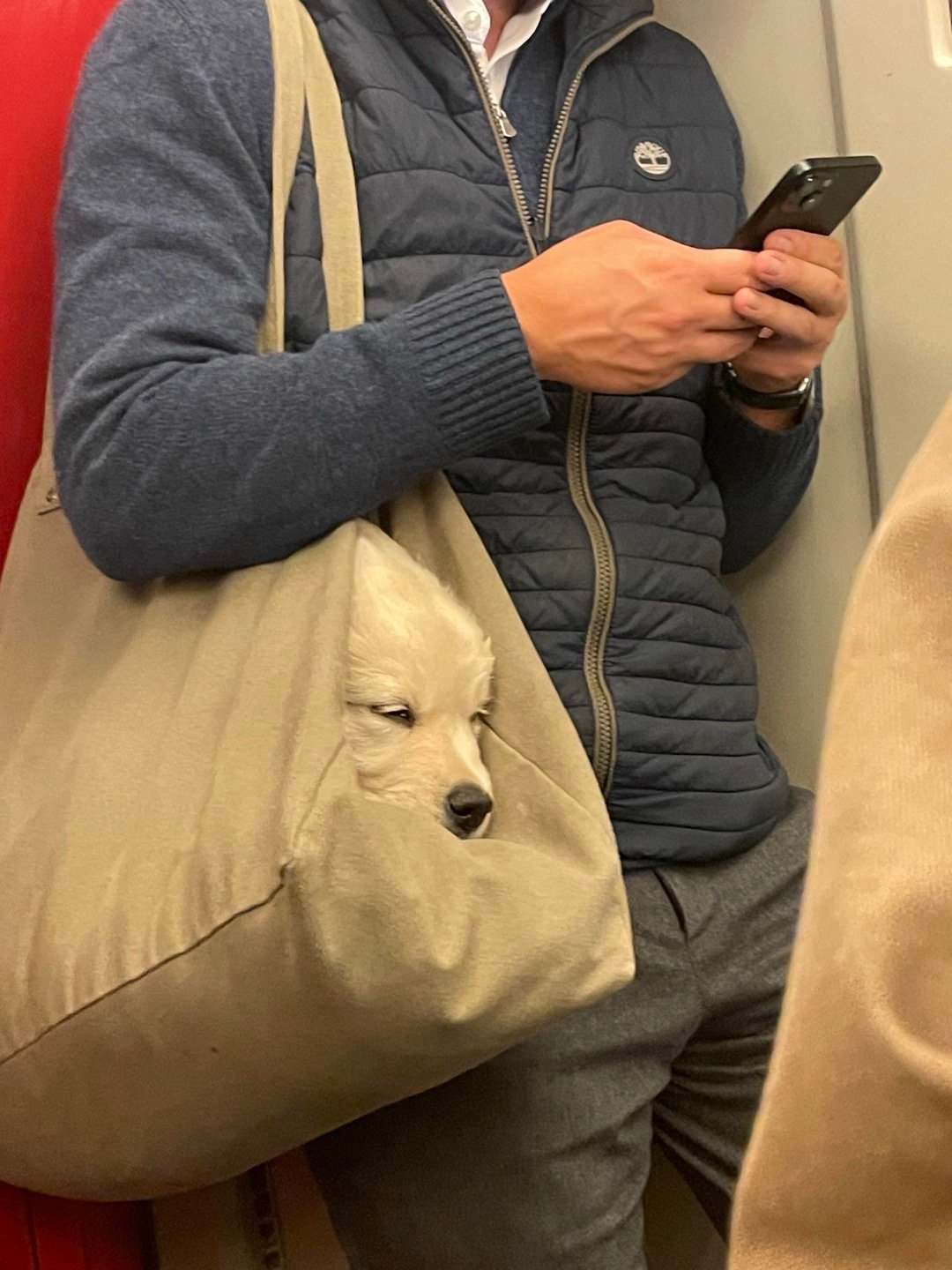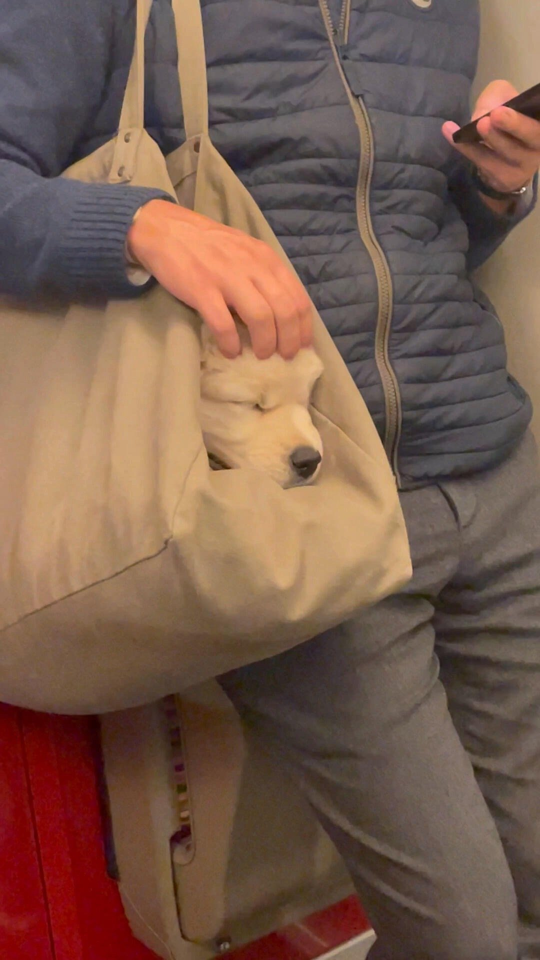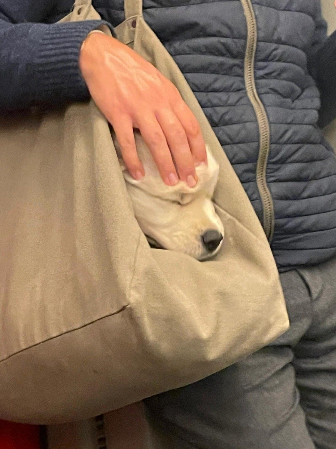 “巴黎地铁上遇到一只乖乖在袋子里睡觉的狗狗,它睡得好熟好香,它的主人偶尔伸手呼噜