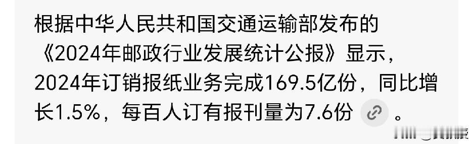 大家还看报纸吗? 这些报纸都是谁定的 想不到还有这么多 根据中华人民共和国交通运输部发布的《2024年邮政行业发展统计公报》显示,2024年订销报纸业务完成169.5亿份,同比增长1.5%,每百人订有报刊量为7.6份 。