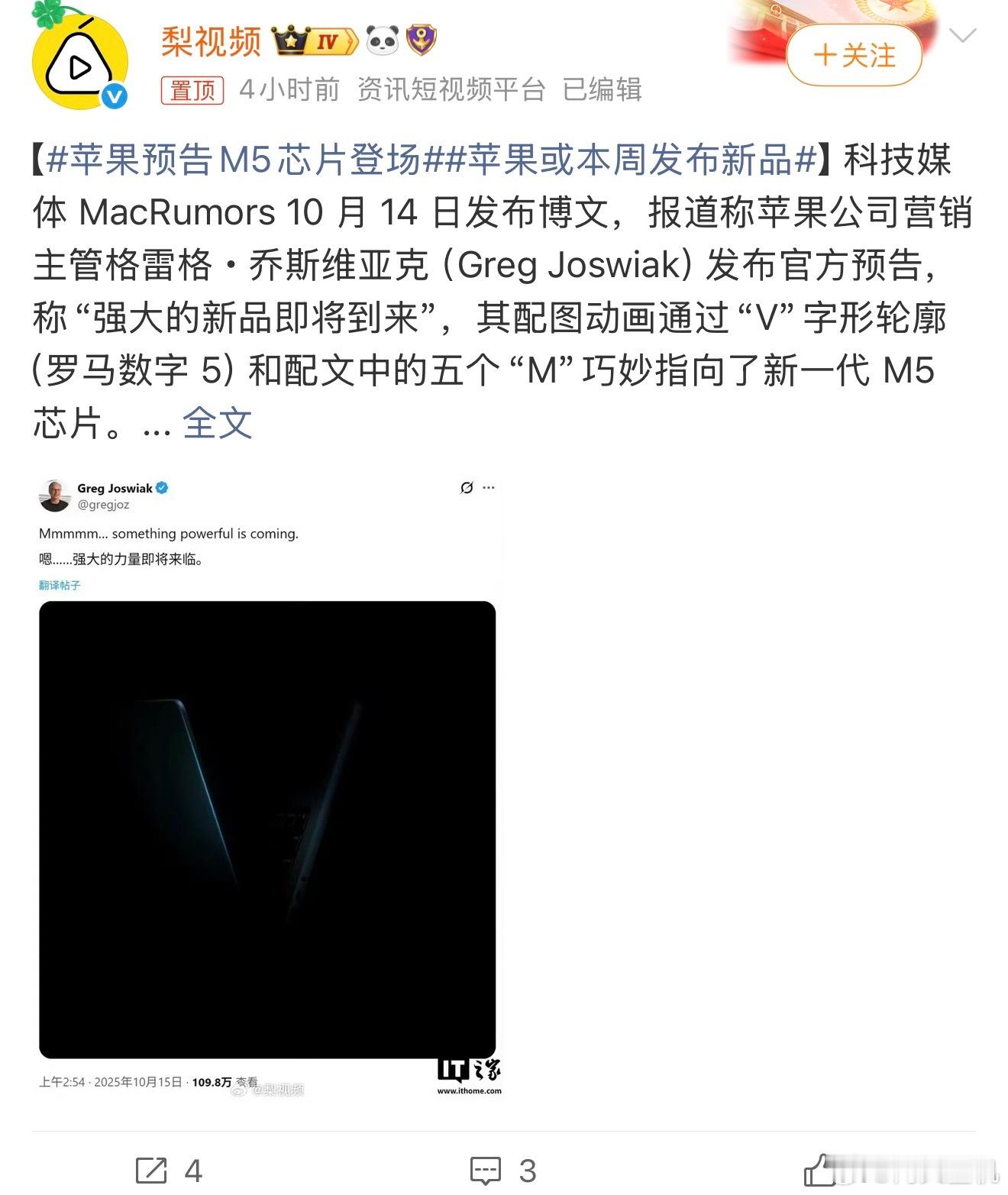 苹果预告M5芯片登场看来M5芯片的iPad Pro要来了,从之前的爆料看M5性能相比M4提升不大,主要提升点在AI算力上,如果日常就是刷剧打游戏等场景的朋友,M5的iPad发布之后M4版本应该会降价,反而是老款的最佳入手时间。