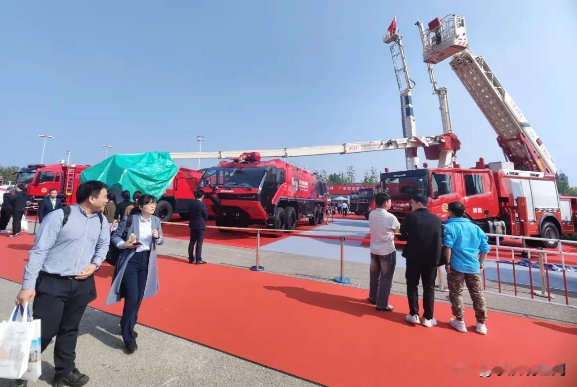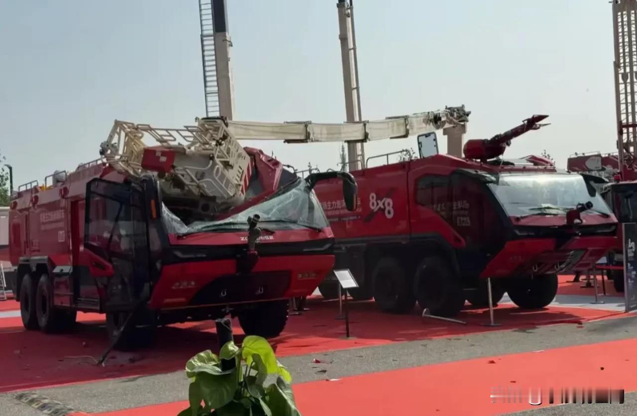 消防设备技术交流展览会上, 我亲眼目睹一辆举高车大臂断裂, 砸到一辆消防车, 庆幸的是未造成人员受伤。