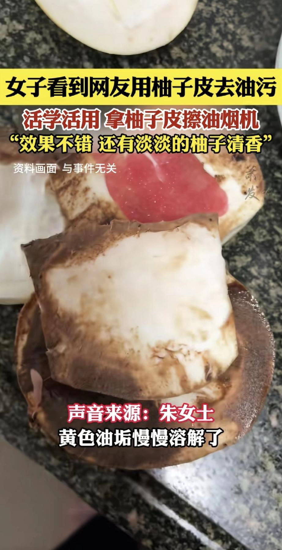 刷到网友用柚子皮去油污的视频,一位女士立马活学活用,拿着柚子皮擦起了油烟机。