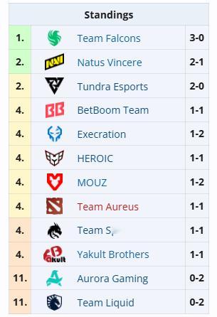Blast新加坡站首日小组赛战绩,Falcons延续了国际邀请赛的强势,他们是第一天唯一3战全胜的队伍,Pure加盟的石头人同样保持着100%胜率但因为赛程原因比猎鹰少赛一场,中国战队YB虽然遭到新科TI冠军的速通但马上稳住了阵脚在Heroic身上拿到一分,而上赛季的两支八强常客Liquid、Aurora在经历变阵没能扭转TI时的低迷,俩队皆以0-2的战绩暂时位列小组垫底