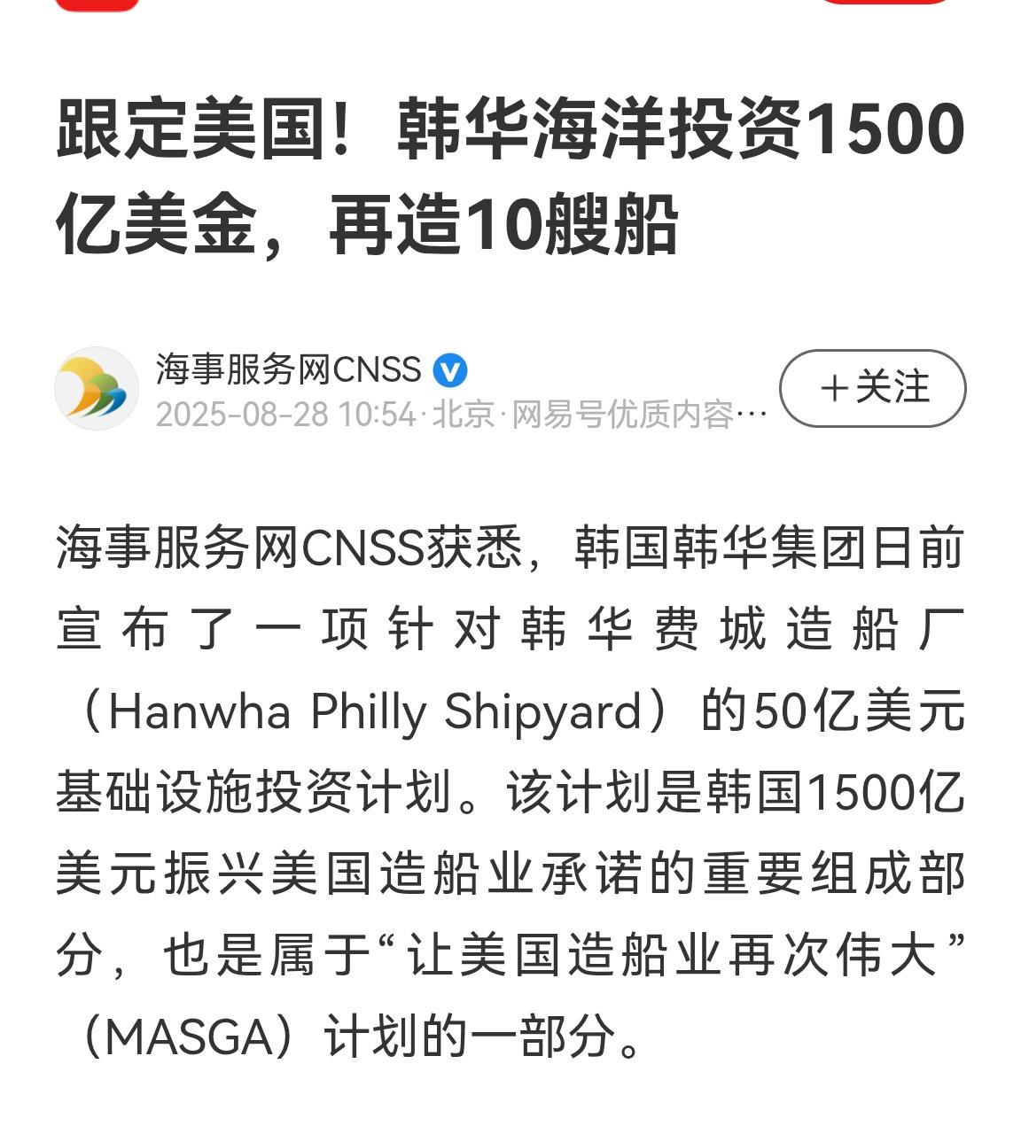 我国前脚刚刚宣布反制裁, 韩国造船巨头股票开始暴跌。 美国前段时间非要对中国造船业搞所谓的 301 调查,还打算收高额港口费,摆明了想打压咱们的产业。 可韩国韩华海洋偏偏往上凑,让自己在美国的子公司帮着美国搞调查。他们打得算盘倒精,觉得把中国造船业挤下去,自己就能抢更多订单。 今年 3 月的时候,韩国确实靠这招拿到了全球 55% 的造船订单,中国的份额从 70% 跌到 35%,可他们忘了自己的命根子早就攥在中国手里了。 韩国造船业有多依赖中国?说出来你都得吃惊。造一艘 LNG 船要上万吨钢材,其中 40% 都得从中国买,更别说发动机、导航设备这些关键零件了,好多都是咱们造的。 更要命的是,他们生产造船用的天然石墨依赖度 97.6%,人造石墨 98.8%,连镓这种关键材料都 98% 靠中国供应。 这些东西可不是随便找个国家就能替代的,美国自己工业都没恢复过来,哪有能力帮韩国补窟窿?就这依赖程度,还敢帮着美国对付中国,这不就是捡芝麻丢西瓜吗? 所以咱们一宣布反制,韩国股市立马有了反应。HD 现代重工 10 月 14 号当天股价就跌了 2.11%,前几天更是连着下跌,3 天跌了快 7 个点。 三星重工更惨,直接领跌造船板块,一天就跌了 4.5%,把之前五天的涨幅全抹没了。整个韩国综合指数都被拖累得跌了 1.04%,这哪是股市波动,分明是市场用脚投票,知道韩国这步棋走臭了。 有人可能觉得这只是偶然,可看看澳大利亚的下场就知道,这都是必然。澳大利亚前几年跟着美国起哄,又是查华为又是搞反倾销,结果呢?2025 年一季度中澳双边贸易额直接降了 21.3%,少了 123 亿美元。 澳大利亚靠铁矿石吃饭,中国一收缩采购,他们出口收入预计得少 110 亿澳元,找印度、东南亚补市场,人家要么只给折扣价,要么需求连零头都不够。这还只是贸易上的损失,产业上的被动更要命,现在想回头和中国做生意,哪有那么容易? 再看韩国自己,不止造船业,整个经济都快被站队折腾垮了。中国都连续二十多年是他们最大的贸易伙伴,2025 年上半年韩国对中国出口占了总出口的 26%,半导体、汽车这些支柱产业,原材料和市场都离不得中国。 就说现代汽车,以前在中国市场还能占 10% 的份额,现在跌到不足 2%,这就是得罪中国市场的下场。 他们嘴里喊着要 "多元化" 摆脱对中国的依赖,可天然石墨、多晶硅这些原材料,美国根本供不上,自己又造不出来,所谓的 "多元化" 纯属自欺欺人。 反观那些不站队的国家,日子过得滋润多了。东南亚那些国家就很聪明,既不和中国闹僵,也不跟美国绑定,该买中国的便宜工业品,就好好做生意;该接美国的订单,也不藏着掖着。 结果呢?他们的贸易额蹭蹭涨,产业还没受啥冲击,这才是精明的做法。要知道,中美两国一个是最大的制造业国家,一个是最大的消费市场之一,两边都不得罪,才能两边都捞好处,非要绑在一棵树上,迟早得跟着摔下来。 现在的局势多清楚啊,中美博弈拼的是综合实力,第三方国家夹在中间,根本没有左右局势的能力,顶多是个棋子。棋子好用的时候被捧着,没用的时候说扔就扔。 韩国帮美国打压中国,真以为美国会真心帮他?美国自己造船业都快垮了,去年还逼着韩国企业投资 50 亿美元扩产能,说白了就是把韩国当冤大头。等韩国把中国市场得罪光了,美国转头可能就会抢韩国的订单,这种亏其他国家又不是没吃过。 再说了,中国的反制从来不是瞎出手,都是被逼得没办法了才反击。这次针对韩华海洋的子公司,已经是留了余地,要是韩国还不清醒,真把中国惹急了,断了石墨、钢材这些原材料供应,韩国那些造船订单就算拿到手,也只能烂在厂里。到时候股价跌的可就不是几个点了,整个造船业都得完蛋。 所以说,韩国造船股暴跌这事儿,就是给全世界敲了个警钟。中美这两个超级国家博弈,小国家最好的选择就是站在旁边看戏,别伸手,别站队。 中国讲究和气生财,只要不损害咱们的利益,生意都能做;可要是非要跟着别人来欺负咱们,那也别想占便宜。澳大利亚的教训还不够深刻吗?韩国这刚跌下去的股价还不够刺眼吗? 现在的世界早就不是谁胳膊粗就听谁的时代了,靠的是互相依存。中国有最全的产业链,有最大的市场;美国有技术有资本,可谁也离不开谁,更别说那些夹在中间的国家。 非要选边站,就像把自己绑在两辆对开的火车上,最后只会被撕得粉碎。韩国现在估计也悔得肠子都青了,可股价跌下去容易,想再涨回来,想再修复和中国的关系,哪有那么简单? 这事儿往大了说,就是大国博弈里的生存智慧。不管是韩国还是其他国家,都得想明白,中美博弈的舞台上,没有旁观者的座位,但绝对有站队者的坟墓。 安安稳稳做自己的生意,不掺和别人的争斗,才是真的聪明,不然迟早得像韩国造船股一样,摔得头破血流。