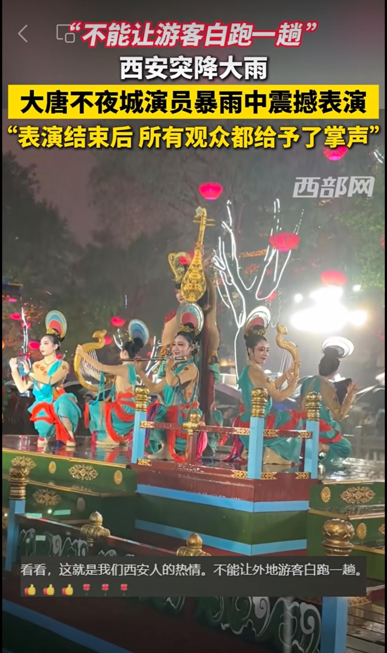 “不能让游客白跑一趟” 西安突降大雨,大唐不夜城演员暴雨中震撼表演,“表演结束后 所有观众都给予了掌声”