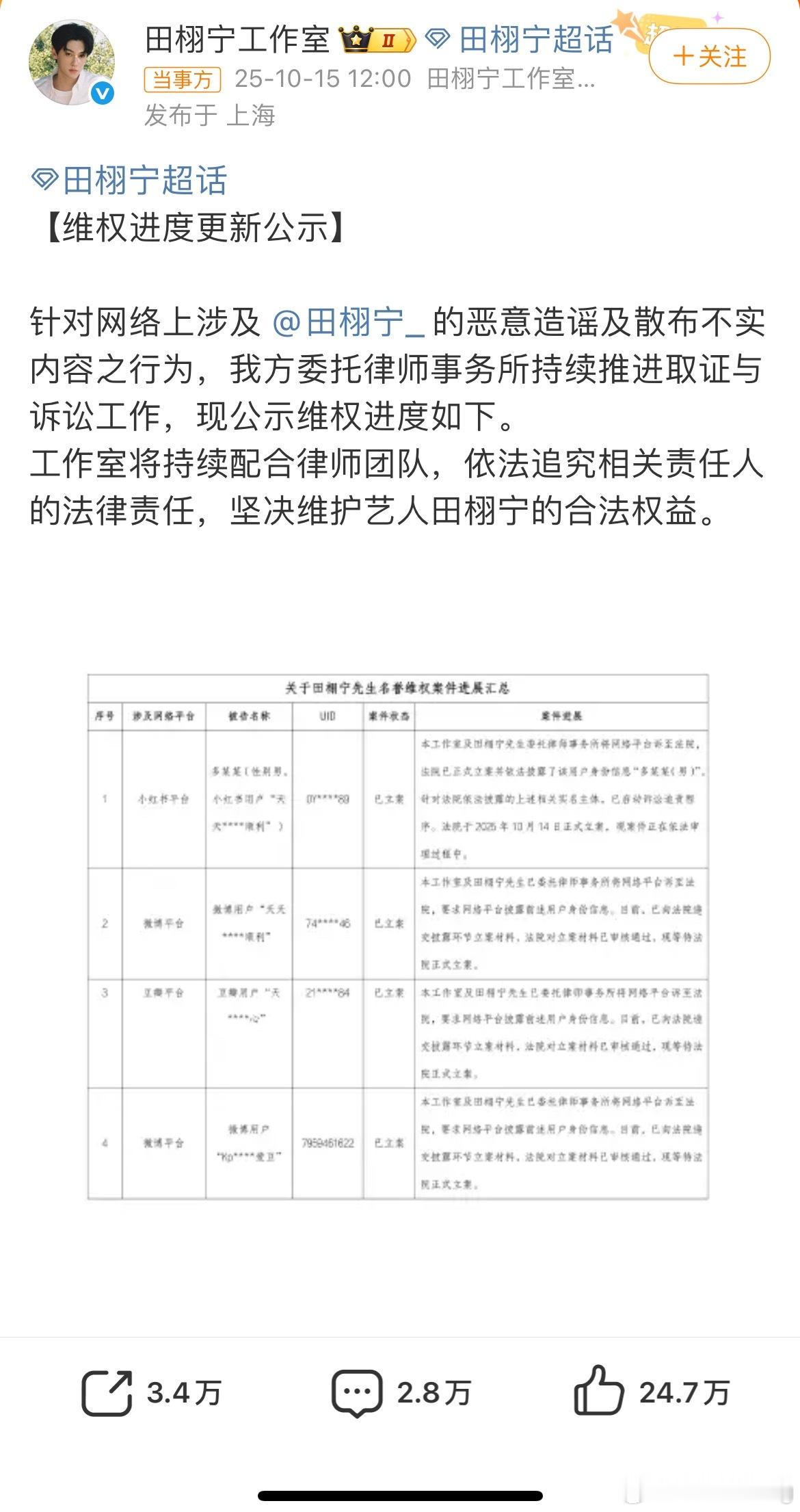田栩宁工作室更新维权进度田栩宁工作室维权了…[捂嘴哭][捂嘴哭]