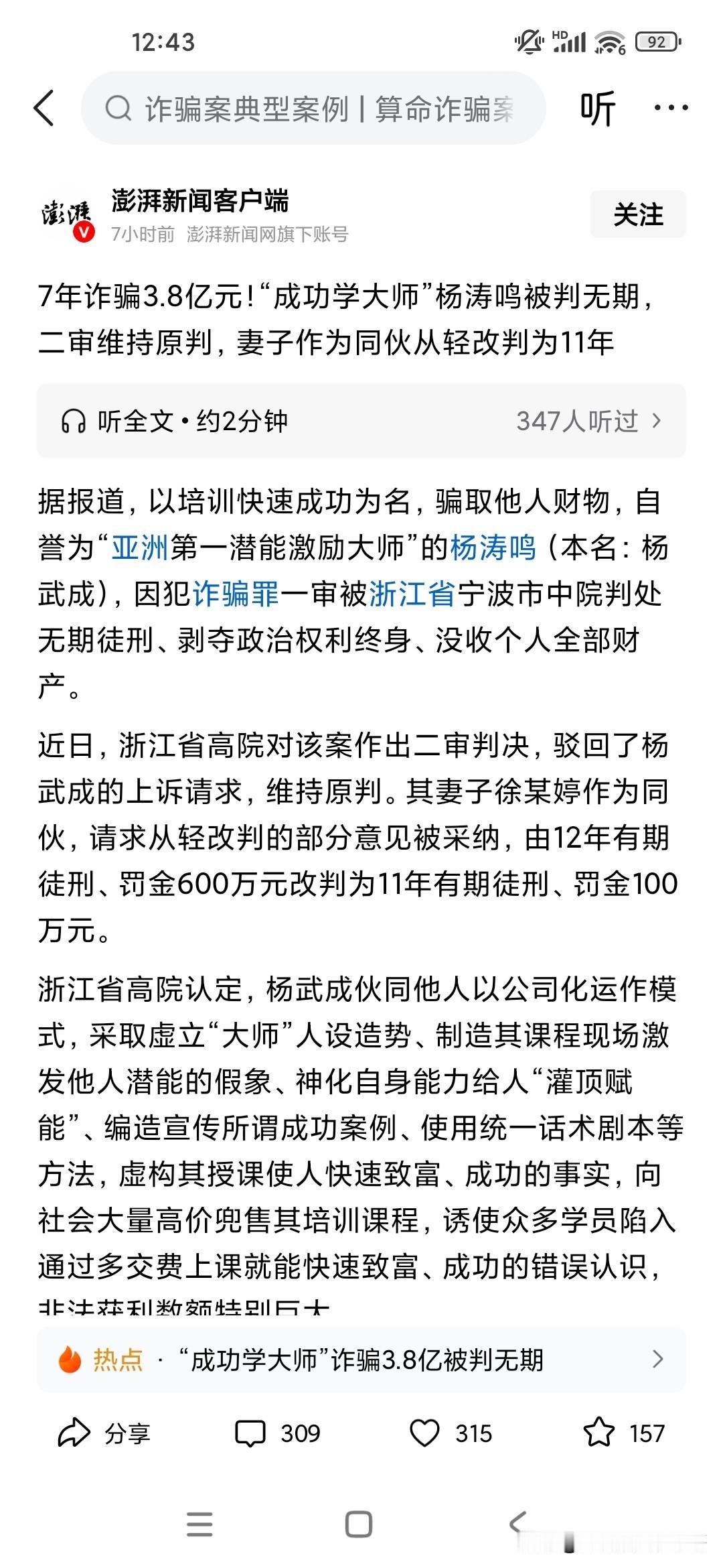 怎么也没有想到大忽悠杨淘明所谓的成功学大师竟然被判了无期,他的老婆以为合伙作案也被判了11年,这是国家的一个重要风向标。也就是告诉那些所谓的江湖骗子及所谓的国学大师们,以后说话做事要谨言慎行了,千万不要虚构诈骗或者制造焦虑。现在经济下行,很多人还不起贷款,生活窘迫,有的甚至失业。所以说现在很多成功学大师就会站出来忽悠,说他可以帮你快速成功,快速发财,快速扭转企业的盈亏,很多人也是因为自己被洗脑了,再加上周围那种环境,你感染我,我感染你,就像疯子一样,说要成功先发疯,所以很多人都被忽悠了,甚至倾家荡产去学习的那种成功学,最后自己几乎都快要破产了,国家也是非常痛恨这种这种公司,因为在网上还可以见到很多这样的大忽悠,大家一定要记得甄别啊,不要傻乎乎的把自己一辈子的积蓄全部投到别讲师身上了,别人只是动动嘴,你就要把几万,10万,十几万,上百万的学费交上去,我觉得太傻了!
