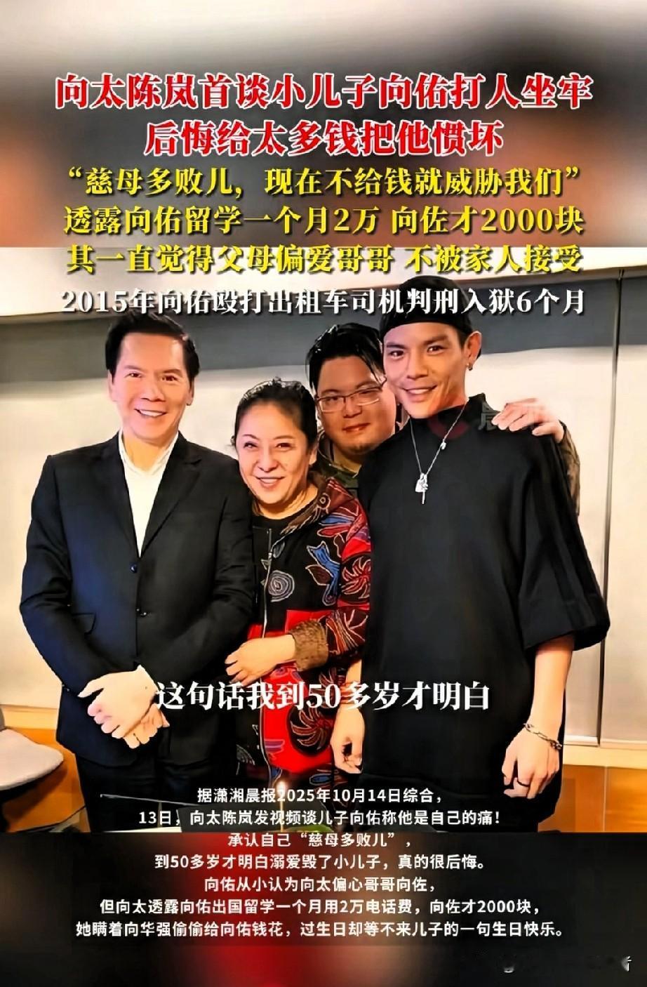 向太含泪说出“慈母多败儿”时,多少人在屏幕前心头一颤。 同一个豪门,两个儿子走向截然不同的人生。向佐在片场拼命证明自己,向佑却活成了“豪门巨婴”的典型——月耗两万却不问候父母,创业失败还拒绝指导,最终那句“你知道我爸爸是谁”,把他送进了本不该去的地方。 向太用物质弥补陪伴的愧疚,却忘了最残酷的真相:没有规矩的爱,是裹着糖衣的毒药。她给了一切,唯独没给儿子面对世界的铠甲。 这哪是豪门独有的悲剧?每个普通家庭都该警惕:当我们用物质代替陪伴,用纵容代替管教,就是在亲手剪断孩子飞翔的翅膀。 真正的爱,从来不是有求必应,而是教会他如何在风雨中站稳。