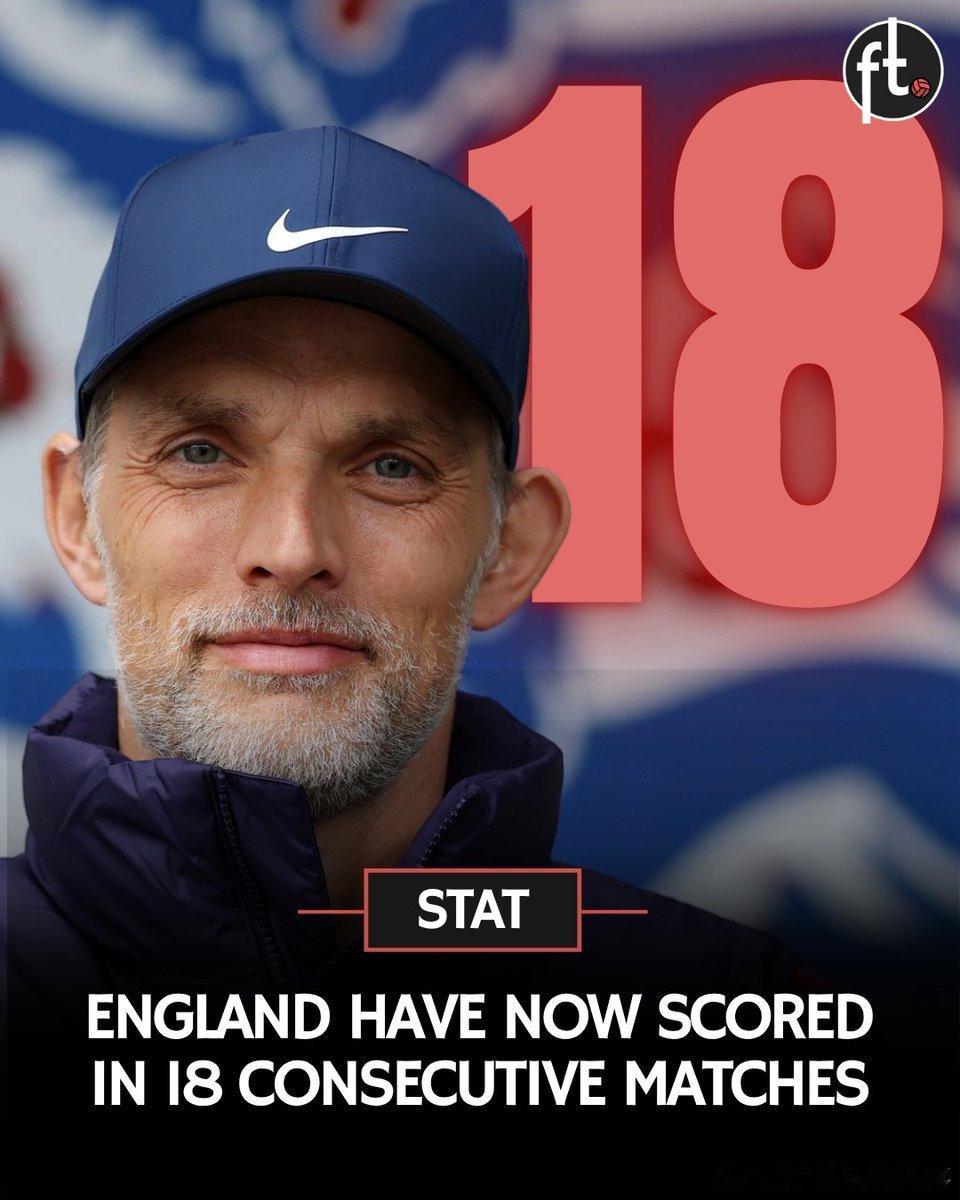 🏴英格兰在各项比赛中已经连续18场都有进球: