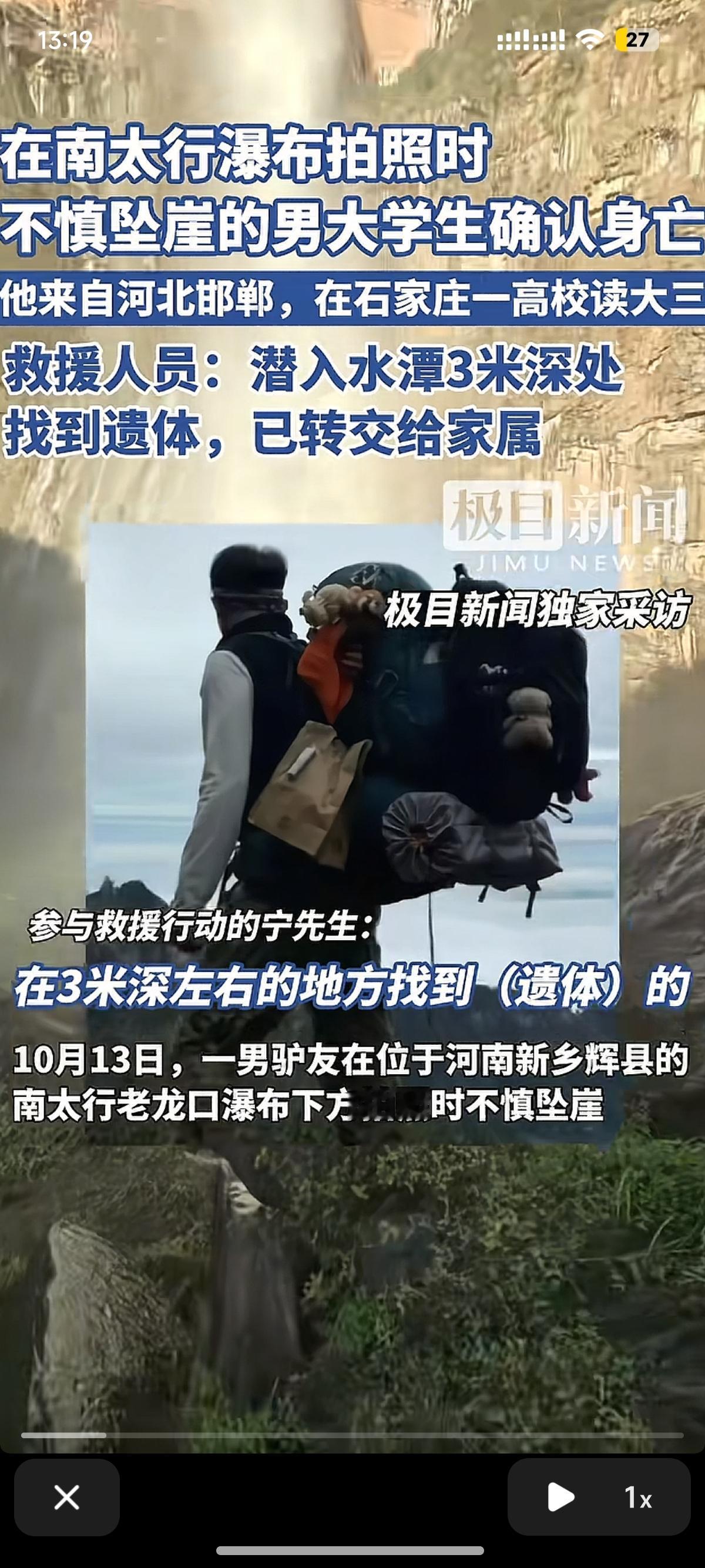 哎,又一起让人心痛的意外。一个22岁的大学生,在南太行山未开发区域徒步时,为了拍张照片从瀑布边坠崖了。等救援队找到他时,人已经没了 听说他是和网上约的几个驴友一起去的,装备看着还挺专业,迷彩裤登山包都齐全。谁想到就在老龙口瀑布那儿,为了拍张照片,人就没了。那地方本来就险,水潭深三米,水流又急,真不是闹着玩的。 这事现在讨论挺多。首先,上课期间跑出去徒步就不太合适。再说同行的伙伴,看到危险情况有没有及时提醒?要我说,既然结伴出行,互相照应是应该的。 要是真看见他站在危险位置却没劝阻,从情理上说确实说不过去。至于法律责任,那得看具体证据,不是咱们在这儿能说清的。 网友说得在理,为了爱好付出生命,留下父母可怎么熬。每次看到这种新闻都想说,喜欢户外探险是好事,但安全必须放在第一位。大自然很美,但也得心存敬畏。 你说可惜不可惜,正是大好年华,为了张照片把命搭进去。说到底,再美的风景都不值得用生命去冒险。希望这事能给爱户外活动的年轻人提个醒:出去玩可以,但一定要量力而行,该做的准备要做足,该注意的安全别大意。 毕竟生命只有一次,真的开不起玩笑。同伴之间也要互相照应,该拉一把的时候得拉一把。