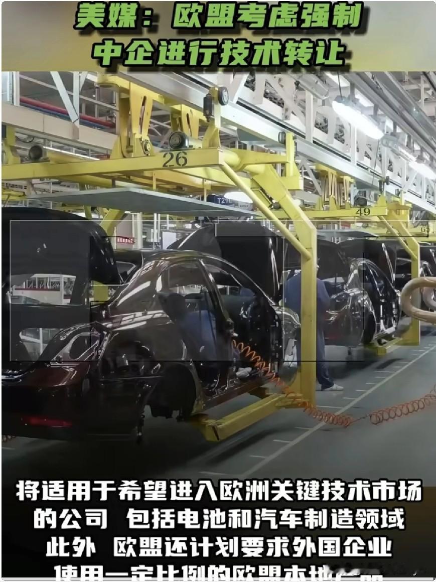 当地时间10月14日,彭博社消息:欧盟正在考虑要求中国公司在欧洲开展业务时必须进行技术转让。 报道称,这些要求将适用于希望进入欧洲关键技术市场的公司,包括电池和汽车制造领域。此外,欧盟还计划要求外国企业使用一定比例的欧盟本地产品,并雇佣欧洲工人。彭博社指出,另一个考虑方案是要求外国企业建立合资公司。 彭博社认为,这类措施虽然形式上适用于所有外国公司,但主要目的是防止中国工业在欧洲占据主导地位。新的监管要求可能在11月正式提出。 欧盟此举意味着保护主义倾向抬头,欧盟可能希望通过技术转让要求,确保欧洲企业能够获取中国公司的先进技术,从而提升本土产业的竞争力。 同时也反映出欧盟对于承认落后的失衡心态。因此试图通过类似政策实现在关键技术上减少对外依赖。 这一政策若实施,可能对中欧经贸关系产生深远影响,并进一步加剧全球贸易紧张局势。然而,通过对话与协商,双方仍有希望找到兼顾各自利益的解决方案。对中欧经济、科技等领域的合作提供新契机。