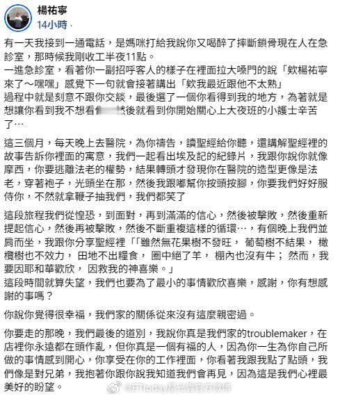 杨祐宁发长文悼念父亲【杨祐宁曝「见71岁父亲最后一面」 3个月天天陪读圣经:会