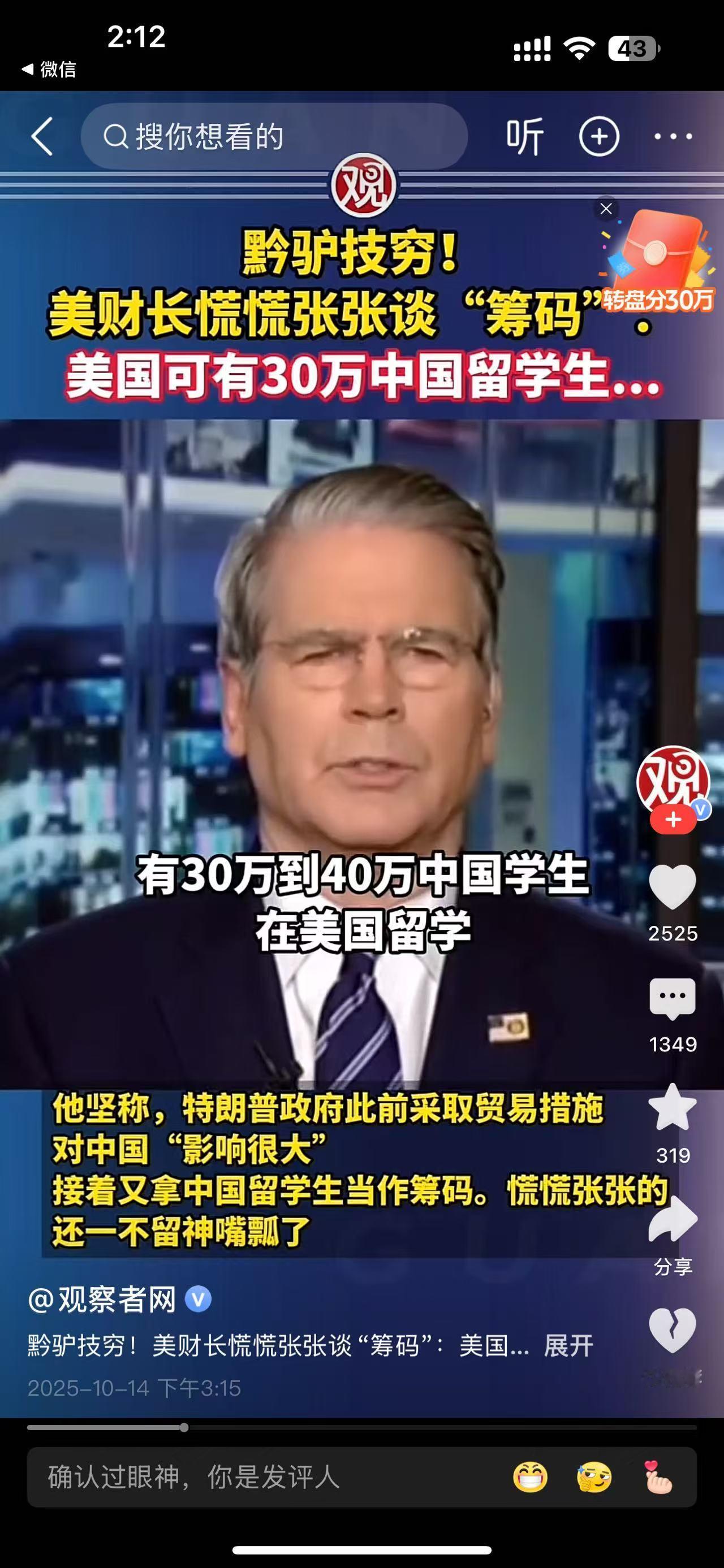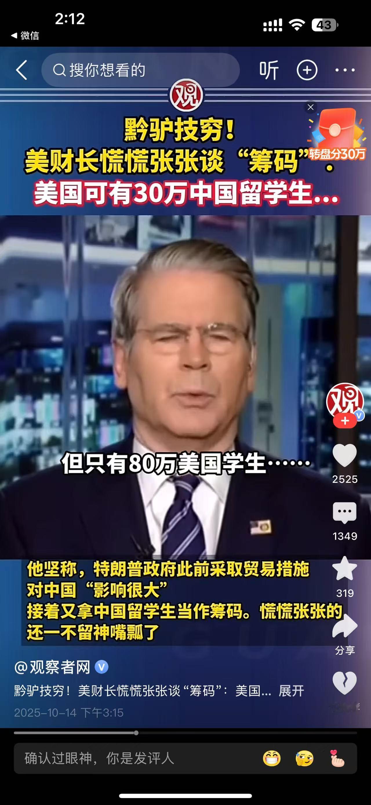 美财长上演“美式服软”:美国还想和中方继续谈判,30万在美中国留学生就是“人质” 当地时间13日,美国财长贝森特在采访中上演了一出经典的“美式服软”:先把责任推给对方,然后说出己方服软的话,仿佛自己非常“宽宏大量”,最后再放点威胁的狠话,显得自己并没有怂。 贝森特嘴上喊着 “维护主权”,心里门儿清美国现在有多需要和中国谈。就拿稀土这事来说,中国刚把几种关键稀土纳入出口管制,美国军工和高科技产业立马就慌了神。 F-35 战机的电机、爱国者导弹的制导系统,甚至特斯拉的动力电池,离了中国的稀土根本造不出来。2025 年第三季度美国从中国进口的稀土直接暴跌 30.9%,通用电气的生产线都停了,洛克希德・马丁的战机交付只能往后拖。 这时候想起要谈判了,可又拉不下脸,只好先把脏水泼给中国,再装出 “愿意沟通” 的样子,典型的既要又要。 最让人不齿的是,美国把主意打到了中国留学生头上,这 30 万孩子根本不是什么 “交流使者”,分明成了他们谈判桌上的筹码。别听美国驻华大使说什么 “真诚欢迎”,数据和事实早把这话戳穿了。 2023 到 2024 学年,在美中国留学生差不多 29.5 万人,一年给美国掏 140 亿美元学费,占了美国国际教育收入的三分之一,比他们赚的知识产权使用费还多。 美国多少公立大学指着这笔钱活,有些理工科实验室的运转全靠中国学生的学费撑着,15% 的美国高校没了这笔收入都可能倒闭。特朗普以前还喊着要把中国留学生扩招到 60 万,说白了就是盯着人家口袋里的钱。 可钱拿在手里,美国又开始犯 “科技焦虑症”,一边赚着留学生的钱,一边又卡着他们的路。 特朗普时期搞的 10043 号总统令,以 “国家安全” 为名,专门针对中国的硕博留学生和学者,过去三年多里,光因为这个法令被拒签、遣返的就超过 5000 人。 2021 年拒了 1964 人,2022 年又拒了 1764 人,这些数字还没算上那些怕被拒根本不敢申请的学生。 贝森特采访时故意提 “30 万中国学生在美国,而我们只有 800 人”,这话里的威胁味儿谁听不出来?就是想告诉中国:你们要是不配合谈判,这些孩子就可能遭殃。 可他忘了,这威胁首先伤的是美国自己。中国留学生占了美国高校人工智能领域研究的 42%,STEM 领域的关键论文好多都是中国学生写的,谷歌前 CEO 施密特早就警告过,把这些人拒之门外,美国的创新领导力就得打折扣。 斯坦福大学的科研经费里,中国学生贡献了 65% 的国际生学费,加州大学系统要是没了中国留学生,一年得损失 47 亿美元,相当于三分之一的科研支出泡汤。 美国现在就是左右为难,想在稀土、芯片这些事上逼中国让步,自己又没底气,只好拿留学生当 “缓冲垫”。两党在 “遏制中国科技” 上达成了共识,可在 “要不要赚留学钱” 上吵得不可开交,政策反复横跳,最后遭殃的还是无辜的学生。 这两年中国留学生赴美人数已经从 37 万高峰跌到 29 万,不少人转头去了欧洲、新加坡,美国高校招不到人,苹果、谷歌这些企业也开始缺人才,这都是他们自己作的。 贝森特这出 “美式服软” 就是场自欺欺人的戏码。先骂中国转移视线,再暗示谈判装大度,最后拿留学生威胁撑场面,可骨子里全是心虚。 30 万中国留学生不是可以随便摆弄的筹码,他们是去求学的孩子,是中美交流的纽带,不是美国政客博弈的工具。美国要是真敢动真格,最先疼的是自己的高校、企业和就业市场。 现在的情况很清楚,美国想谈,就得拿出诚意,别玩这些拿孩子当人质的龌龊手段。中国从来不怕施压,稀土管制让美国制造业 PMI 跌了 5.2 个百分点,大豆价格跌到十年最低,这些都是美国霸道的代价。 要是继续拿留学生说事,只会把路走死,最后丢了 “金主” 又失了人才,那才真是得不偿失。贝森特们该醒醒了,霸权那套不好使了,想谈判就得放下偏见,好好说话,别再让无辜的孩子为美国的焦虑买单。
