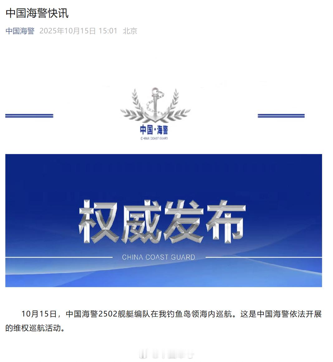 【中国海警在我钓鱼岛领海内巡航】10月15日,中国海警2502舰艇编队在我钓鱼岛领海内巡航。这是中国海警依法开展的维权巡航活动。(中国海警)
